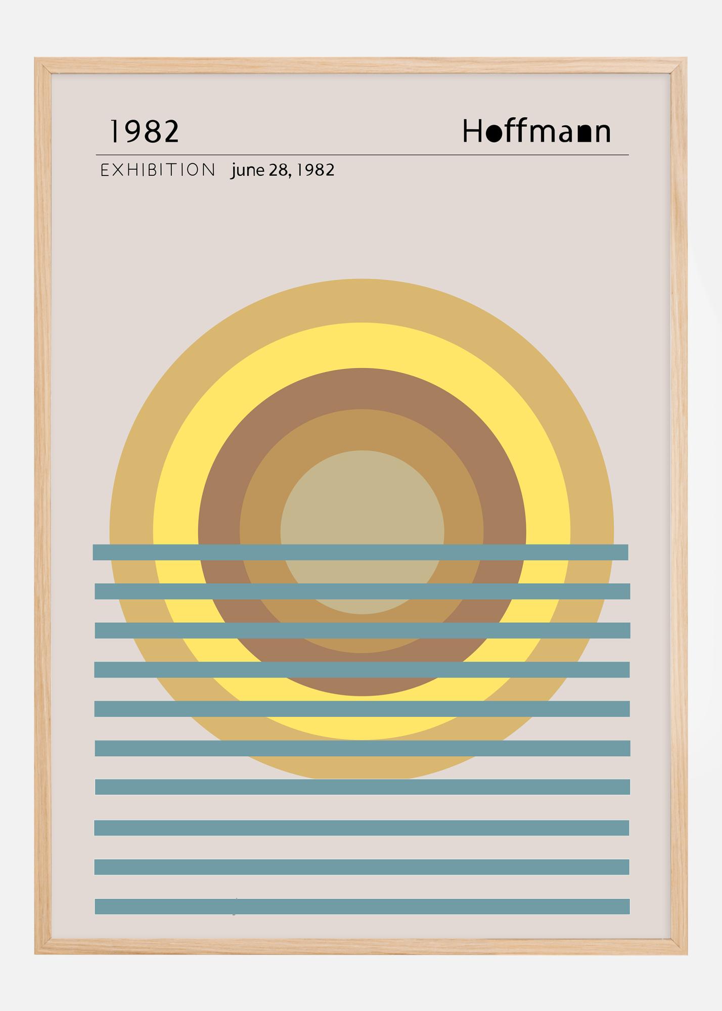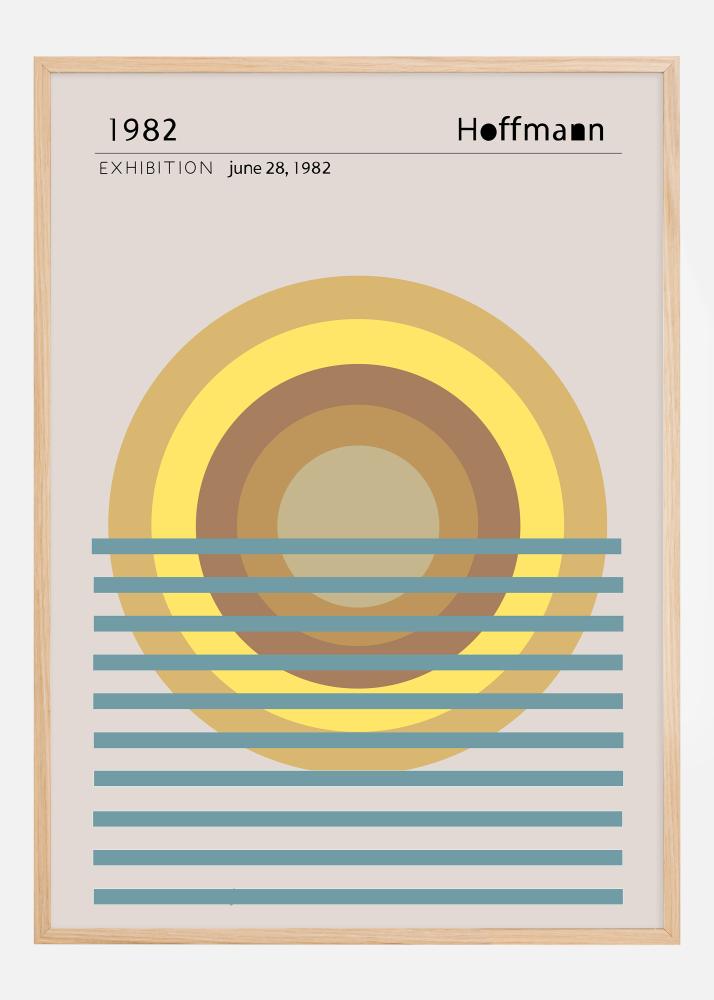 Dieses stilvolle und konzeptionelle Poster ist eine Hommage an Hoffmanns Ausstellung von 1982. Es zeigt eine Serie von sich überlappenden Kreisen und Linien, die eine Illusion eines Sonnenuntergangs über dem Wasser erzeugen. Die Farbpalette ist warm und einladend, mit Tönen von Gold, Gelb und Braun, die im Kontrast zu kalten Blautönen stehen und ein Gefühl von Gleichgewicht zwischen Tag und Nacht, Wärme und Kälte vermitteln.