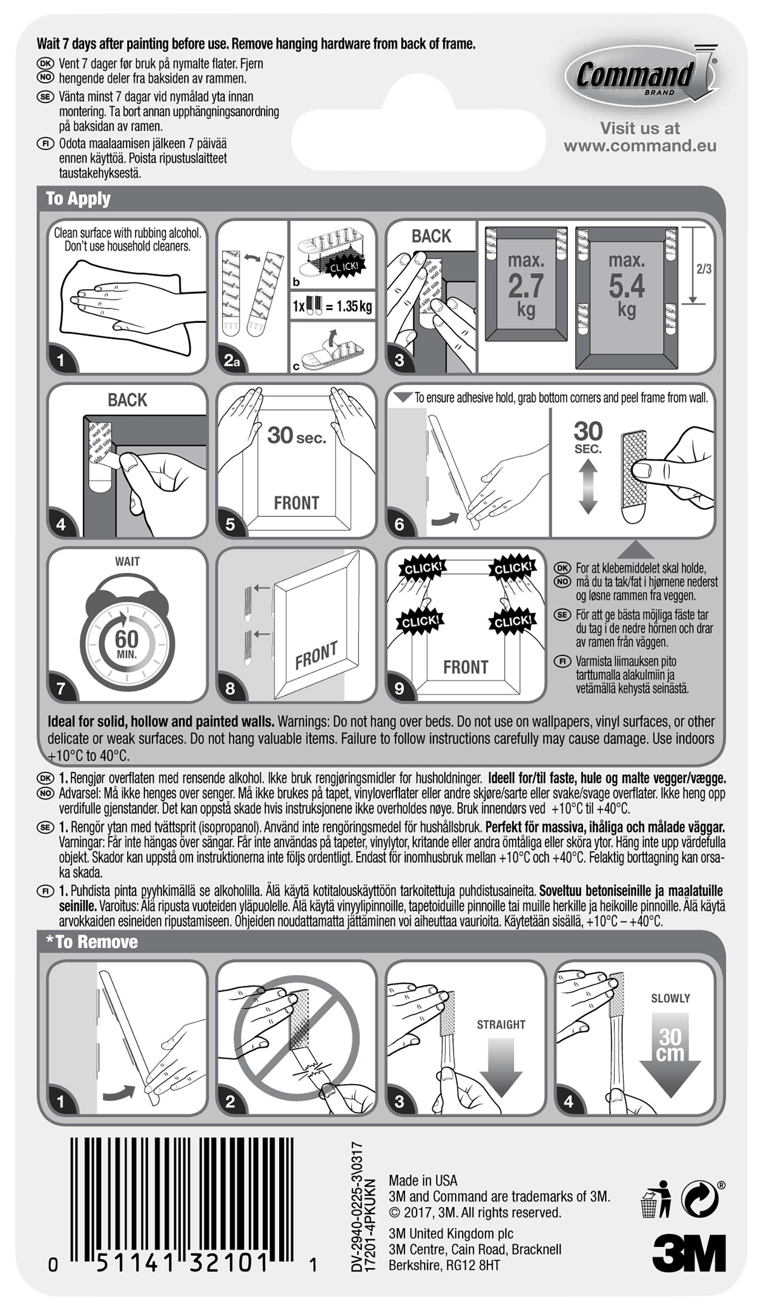 Anleitung: Reinige zunächst die Wandoberfläche und lasse sie danach trocknen (die Wand sollte nicht beschädigt sein). Verbinde die beiden Klettbänder miteinander und entferne das am Klebestreifen befestigte Schutzplastik. Befestige den Klebestreifen an der Rückseite des Rahmens und drücke ihn fest. Wenn du alle Klettbänder am Rahmen festgemacht hast, entferne das Schutzplastik, das jetzt nach außen zeigt, um dein Bild an die Wand zu hängen. Nimm das Bild danach wieder von der Wand, indem du die beiden Klettbänder voneinander löst, und drücke das an der Wand befestigte Klettband etwa 30 Sekunden lang fest. Um den Klebstoff einwirken zu lassen, warte 60 Minuten, bevor du das Bild wieder befestigst. Schau dir auch das Anleitungsvideo unten an.