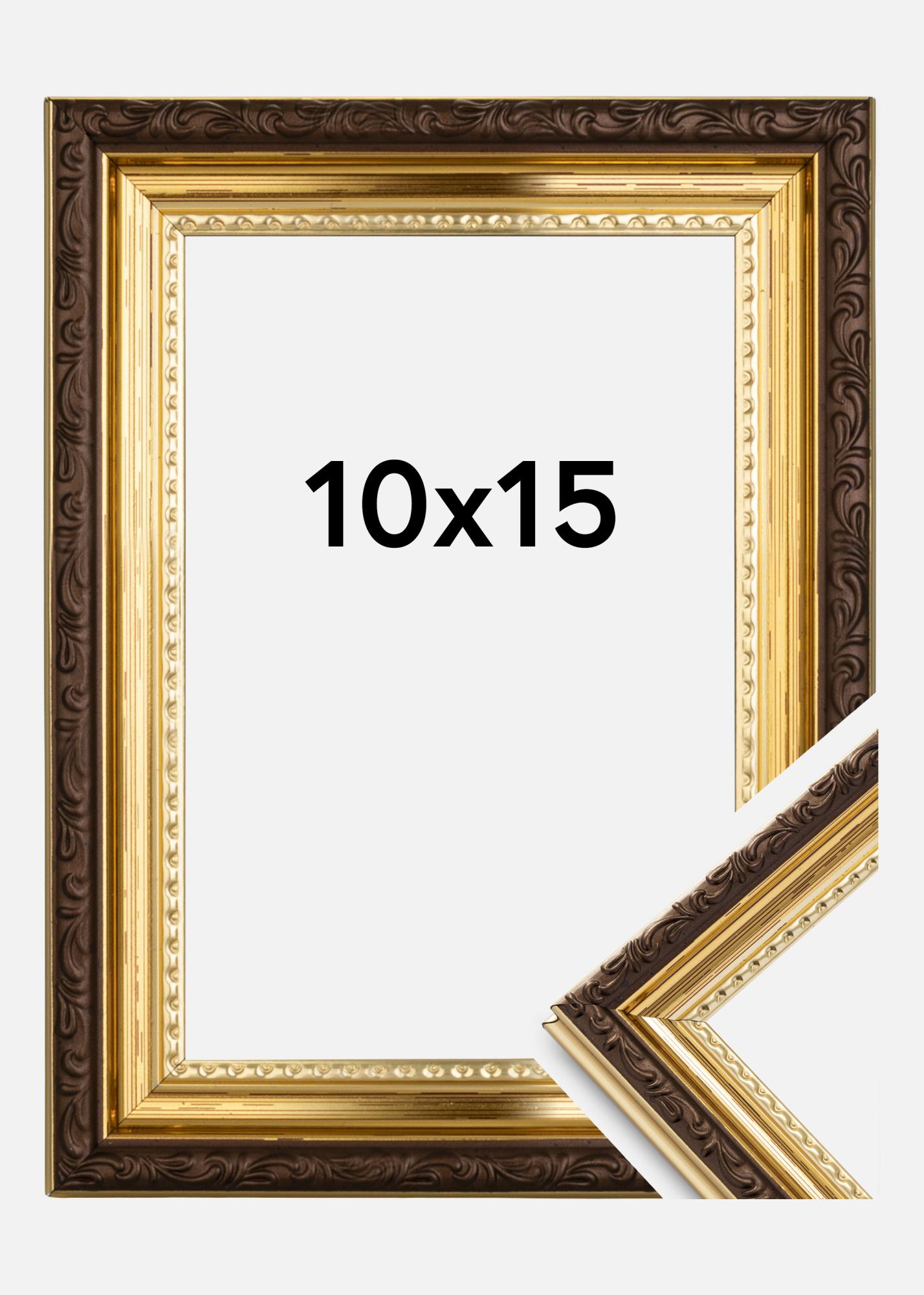 Abisko ist ein eleganter goldfarbener Fotorahmen im Retro-Stil mit feinen Verzierungen. Der Bilderrahmen ist golden mit roten Elementen und hat einen schönen verzierten Rand in einer warmen braunen Farbe. Perfekt, wenn du auf der Suche nach einem alt aussehenden Goldrahmen bist.