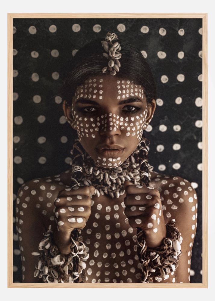 Hier wirst du von einem festen Blick einer jungen weiblichen Aborigine mit weißer Körperbemalung und schönen Schmuckstücken aus Naturfaden und Muscheln empfangen. Ein erdverbundenes Fotokunst poster, das sich sowohl in einsamer Majestät als auch an der modernen Bildwand gut macht.