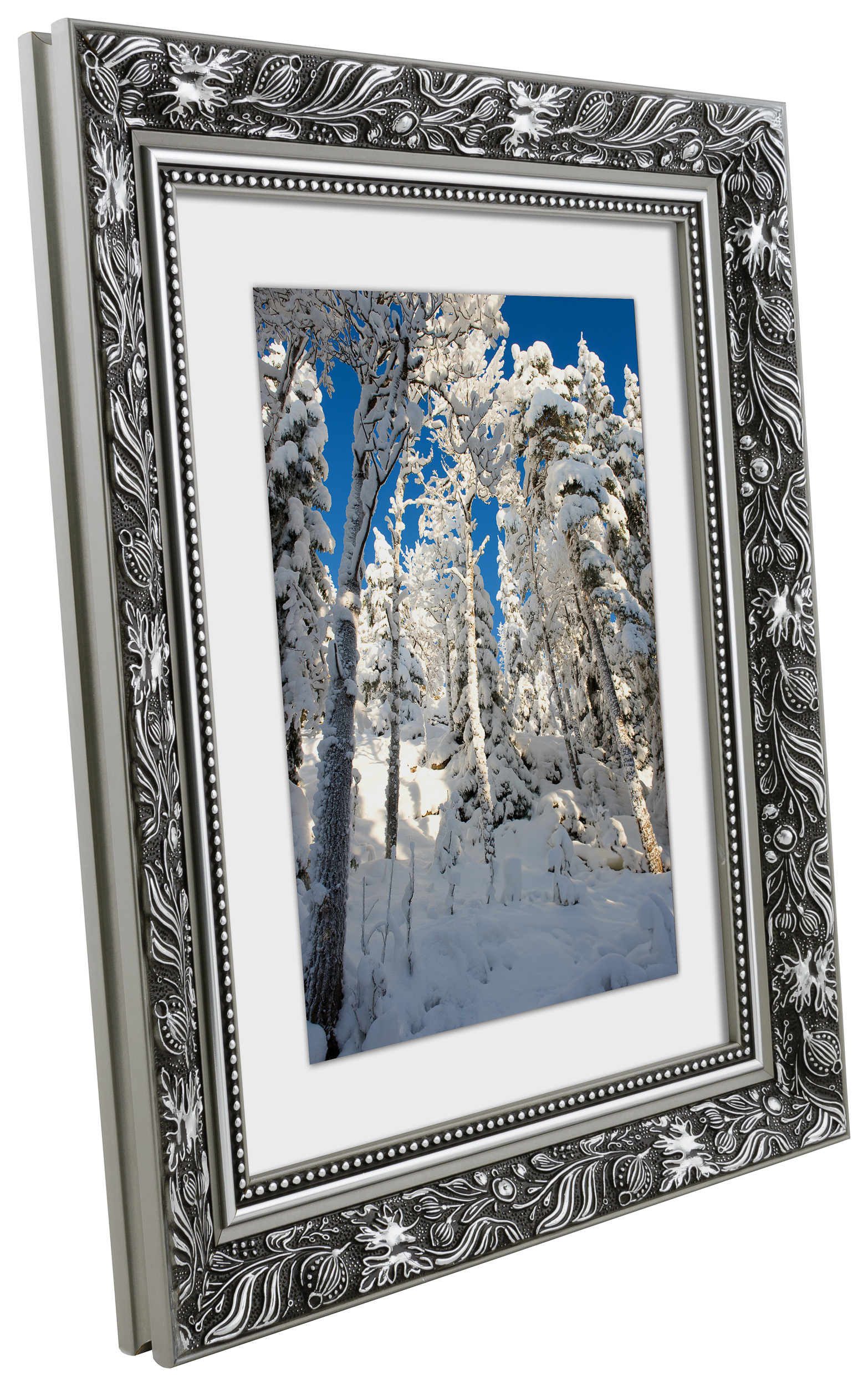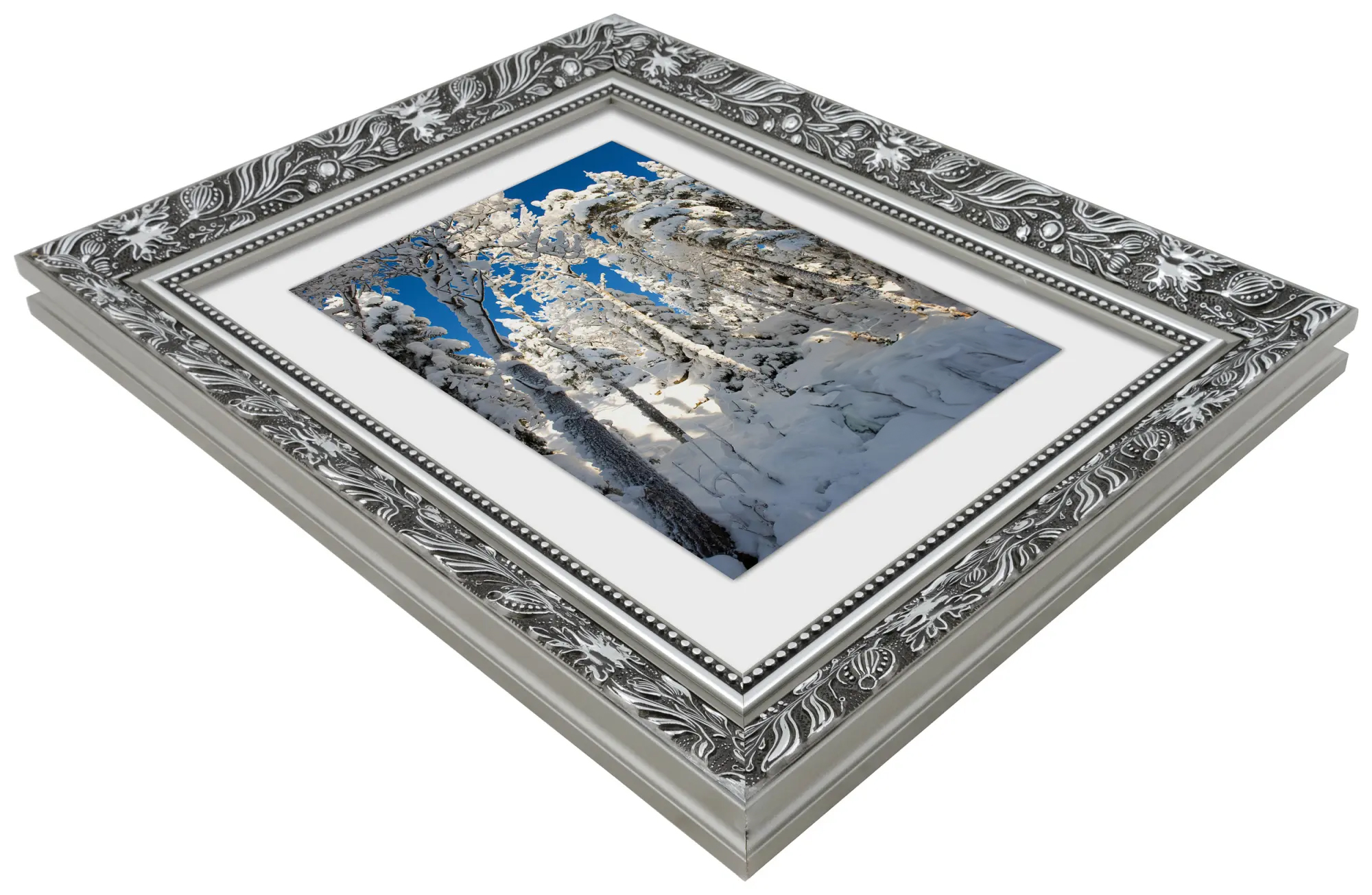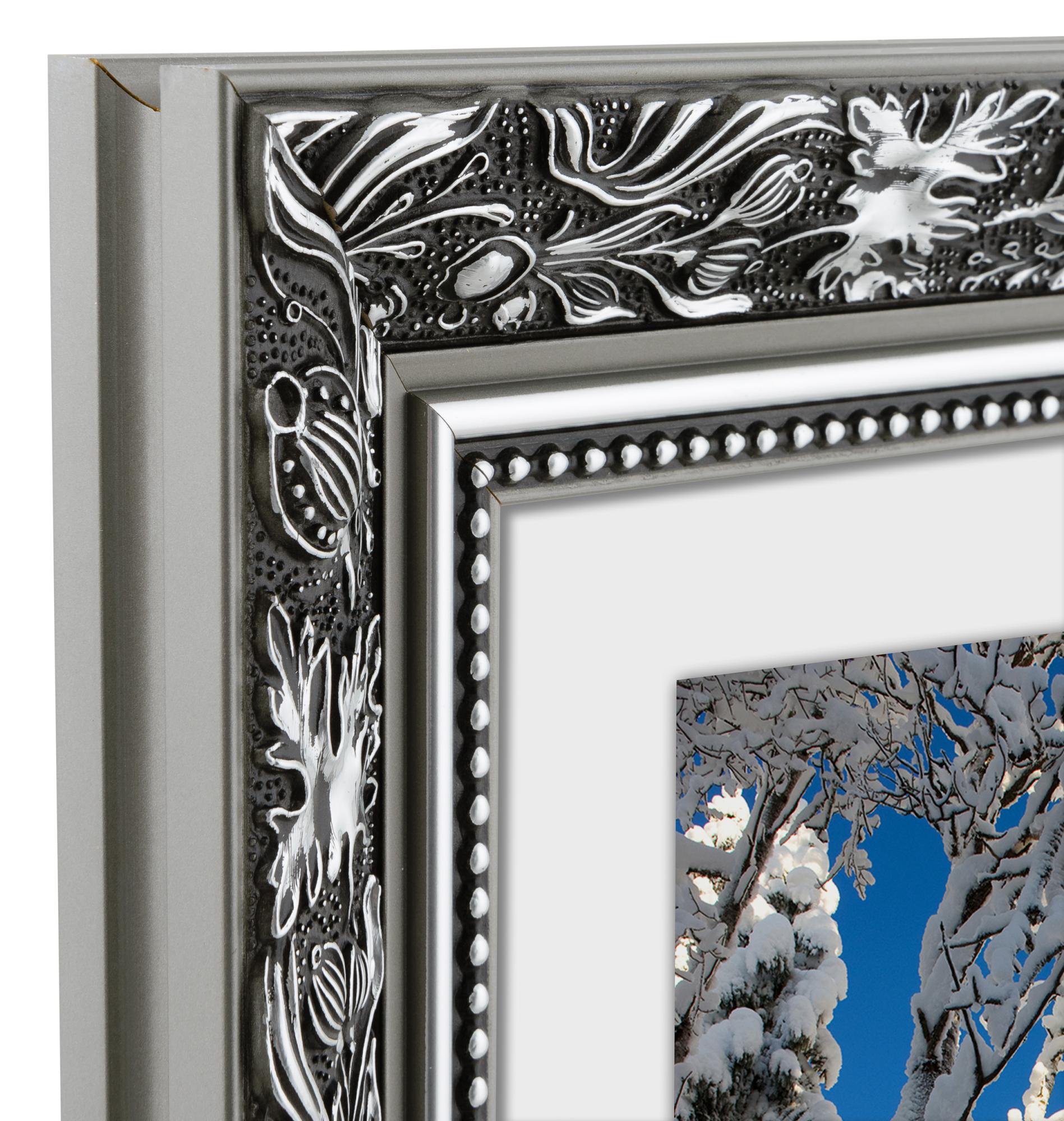 Hol dir ein bisschen Luxus für deine Wand und mach dein Bild zum Blickfang! Dieser wundervolle Bilderrahmen hat ein Doppelprofil, was ihn besonders schön an der Wand wirken lässt. Die Kanten sind komplett in Silber gehalten, während die Vorderseite schwarz ist und ein silberfarbenes Muster mit Blättern und gewundenen Formen aufweist. Direkt neben dem Glas verläuft ein silberner Rand und ein schwarzer Abschnitt mit einem silbernen Perlenmuster. Da der Bilderrahmen nach deinen gewünschten Maßen hergestellt wird, kannst du sicher sein, dass er genau dort hinpasst, wo du ihn haben willst.