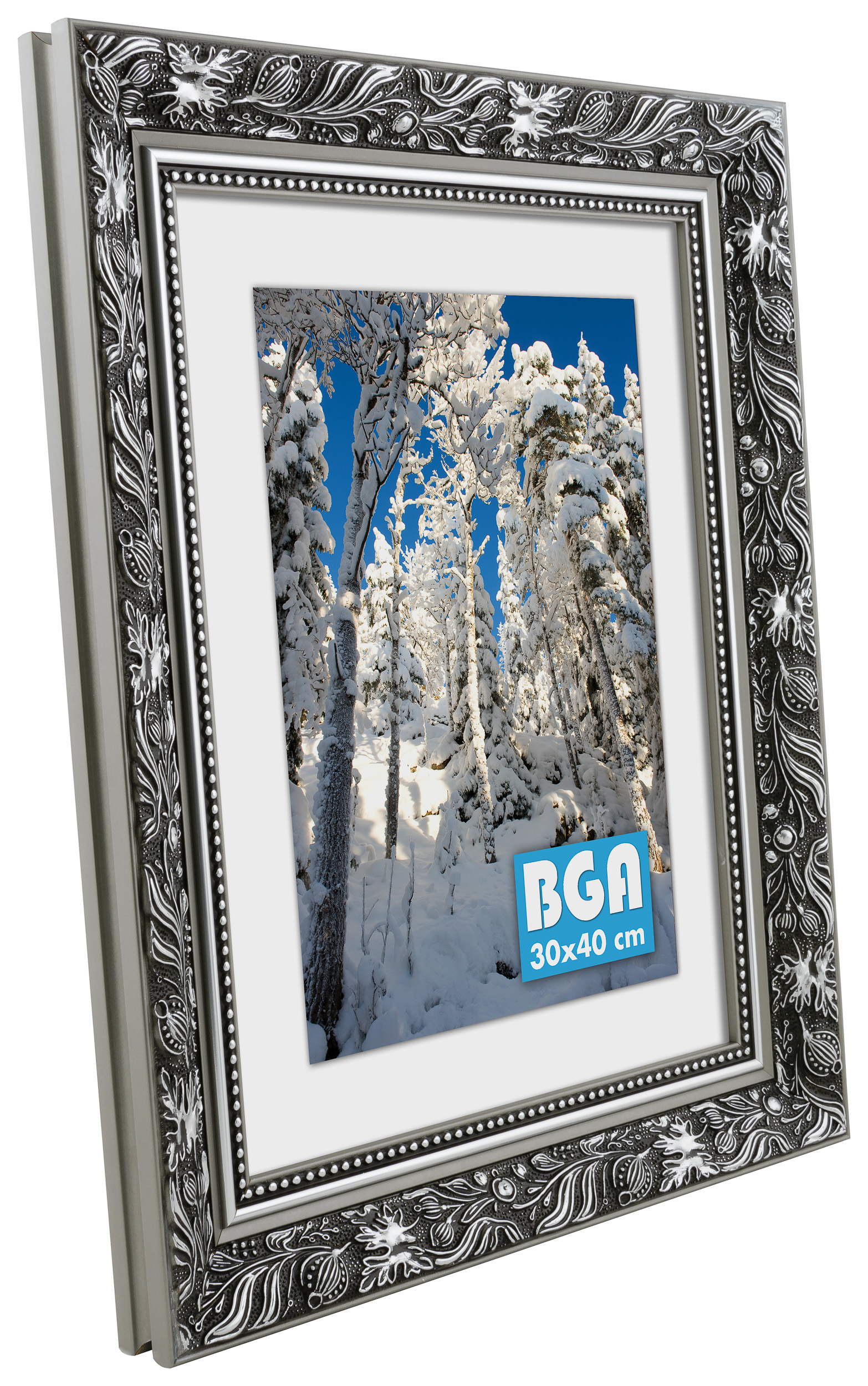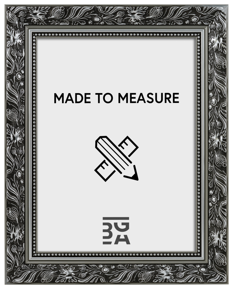 Hol dir ein bisschen Luxus für deine Wand und mach dein Bild zum Blickfang! Dieser wundervolle Bilderrahmen hat ein Doppelprofil, was ihn besonders schön an der Wand wirken lässt. Die Kanten sind komplett in Silber gehalten, während die Vorderseite schwarz ist und ein silberfarbenes Muster mit Blättern und gewundenen Formen aufweist. Direkt neben dem Glas verläuft ein silberner Rand und ein schwarzer Abschnitt mit einem silbernen Perlenmuster. Da der Bilderrahmen nach deinen gewünschten Maßen hergestellt wird, kannst du sicher sein, dass er genau dort hinpasst, wo du ihn haben willst.