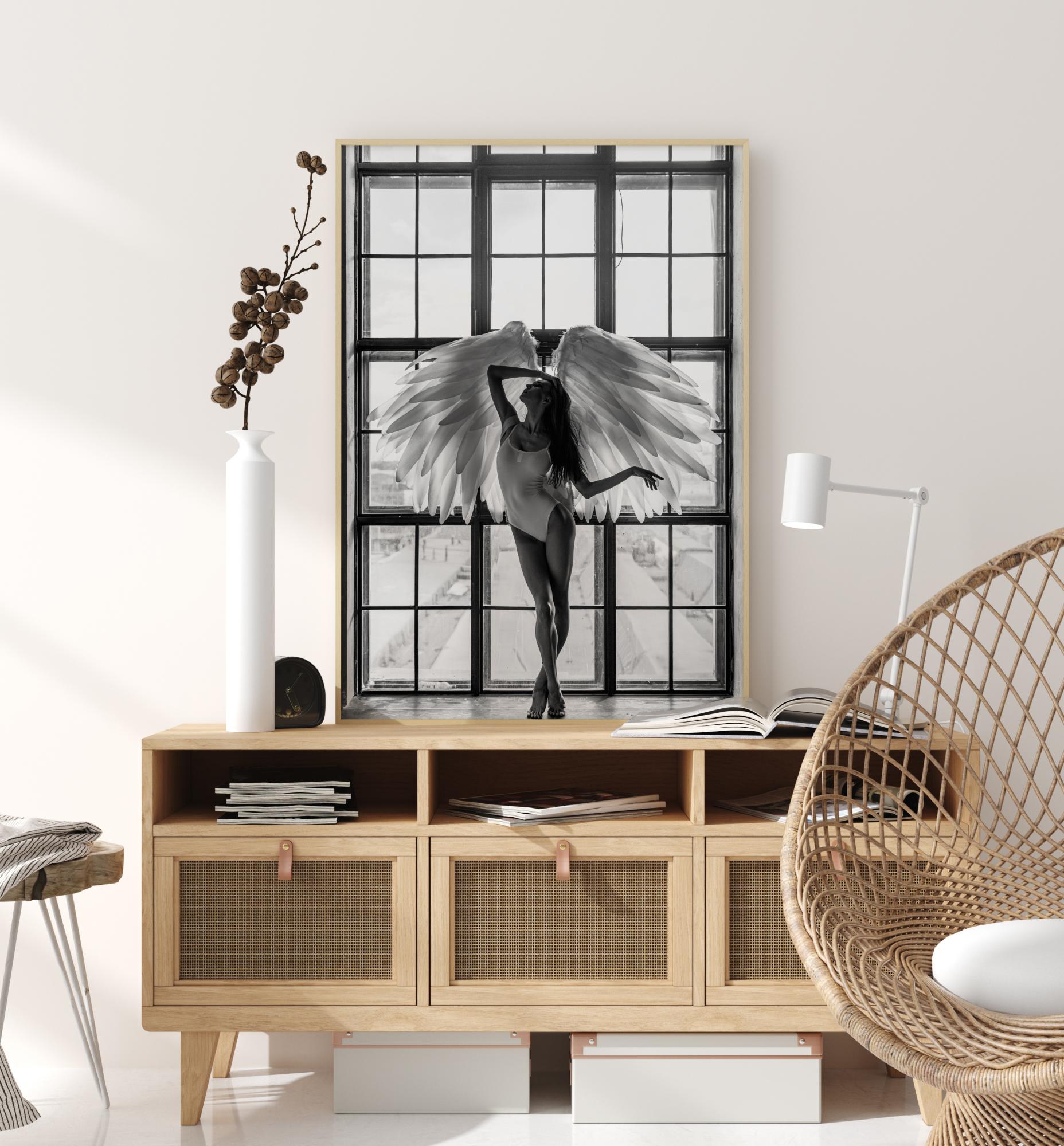Ein schöner Fotokunst poster in dunkler Grauskala einer Frau, die in einem großen Fenster in einem Body und großen, schönen Engelsflügeln posiert. Ein poster, das leicht mit anderen Favoriten kombiniert werden kann, aber auch alleine als Blickfang dient.