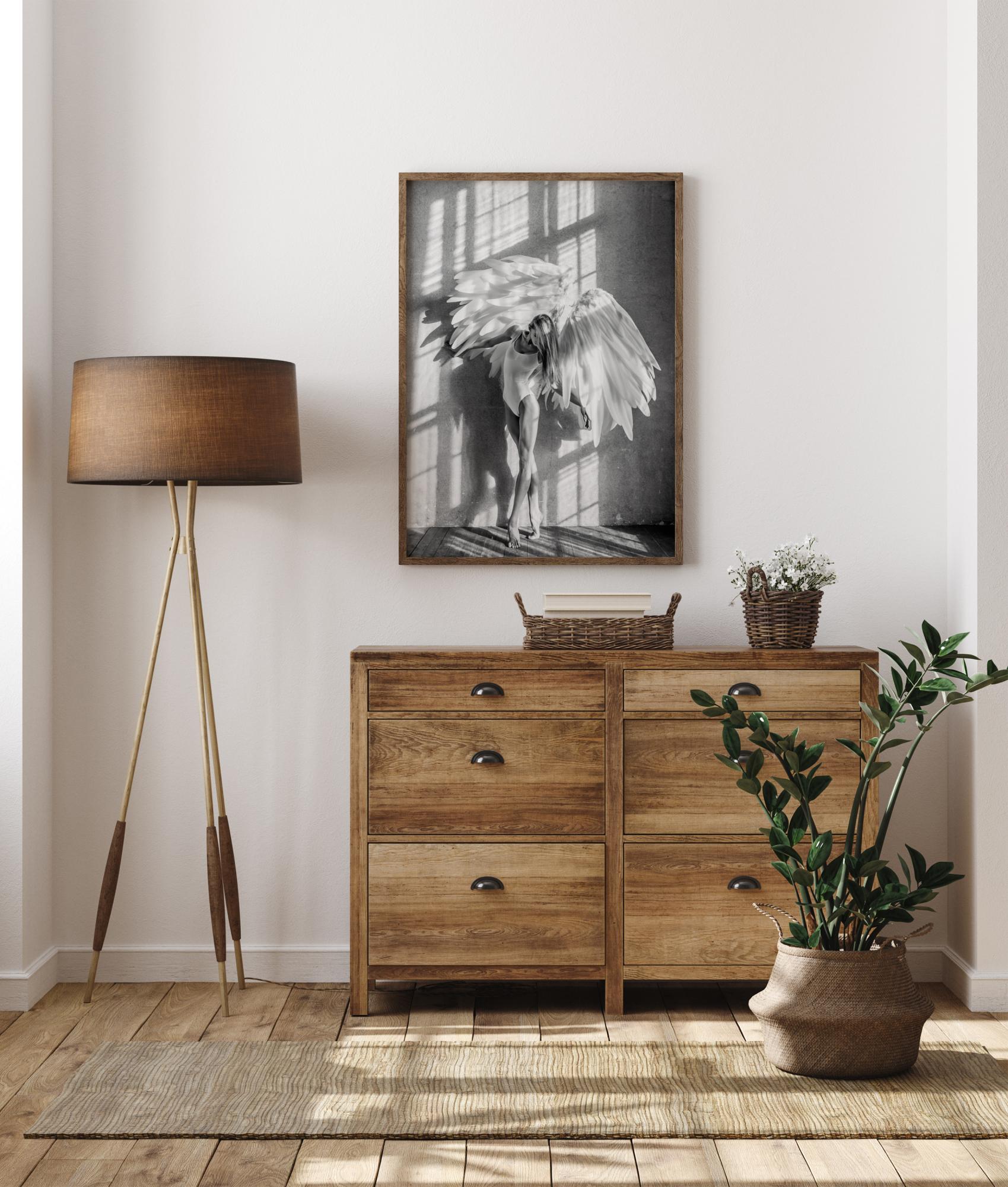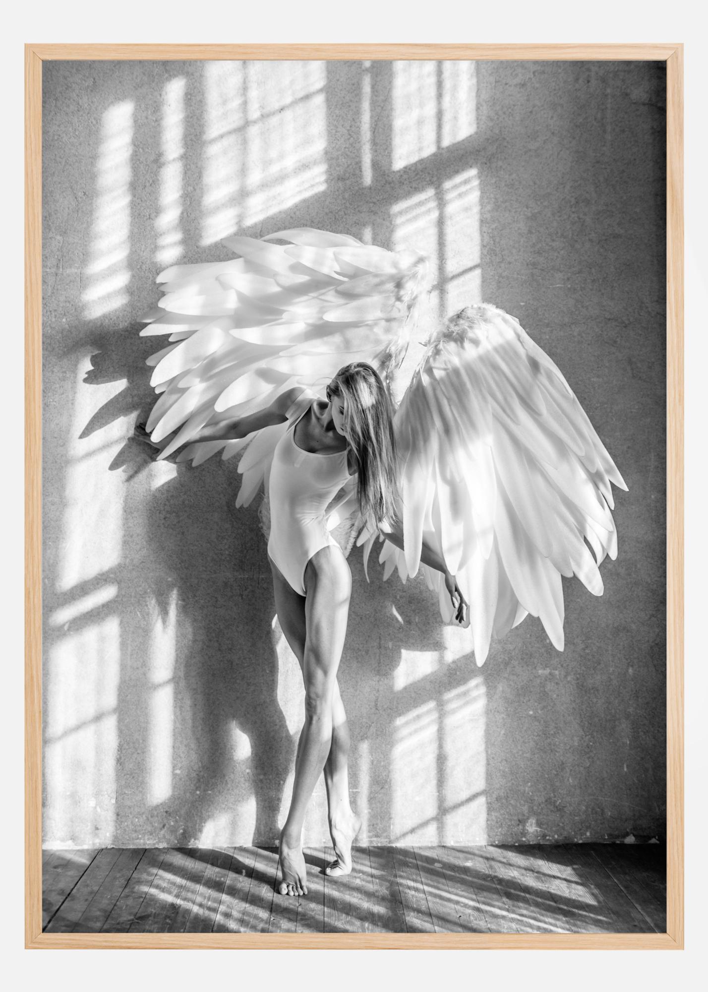 Ein herrlicher Fotokunst poster in weichem Graustufen von einer Frau, die wie eine Ballerina posiert, mit einem Paar großer Engelsflügel im Licht eines gigantischen Fensters, dessen Schatten über das Bild spielen. Dies ist ein poster für jeden, der einen weichen und schönen Touch in seinem Zuhause wünscht.