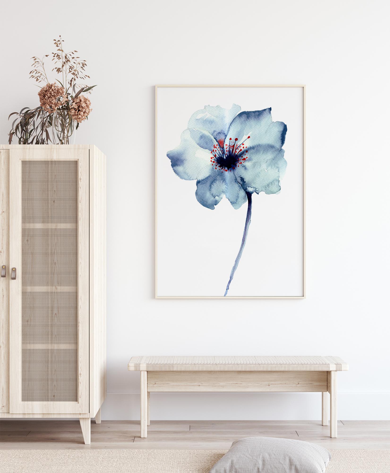 Eine prächtige Blume in Blau und Rot Aquarell gemalt. Ein schönes Poster in all seiner Einfachheit, das sowohl in der Küche oder im Flur als auch im Wohnzimmer oder Schlafzimmer gut passt.