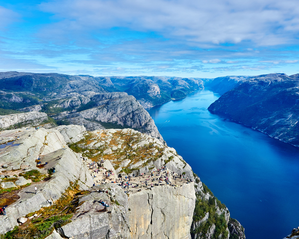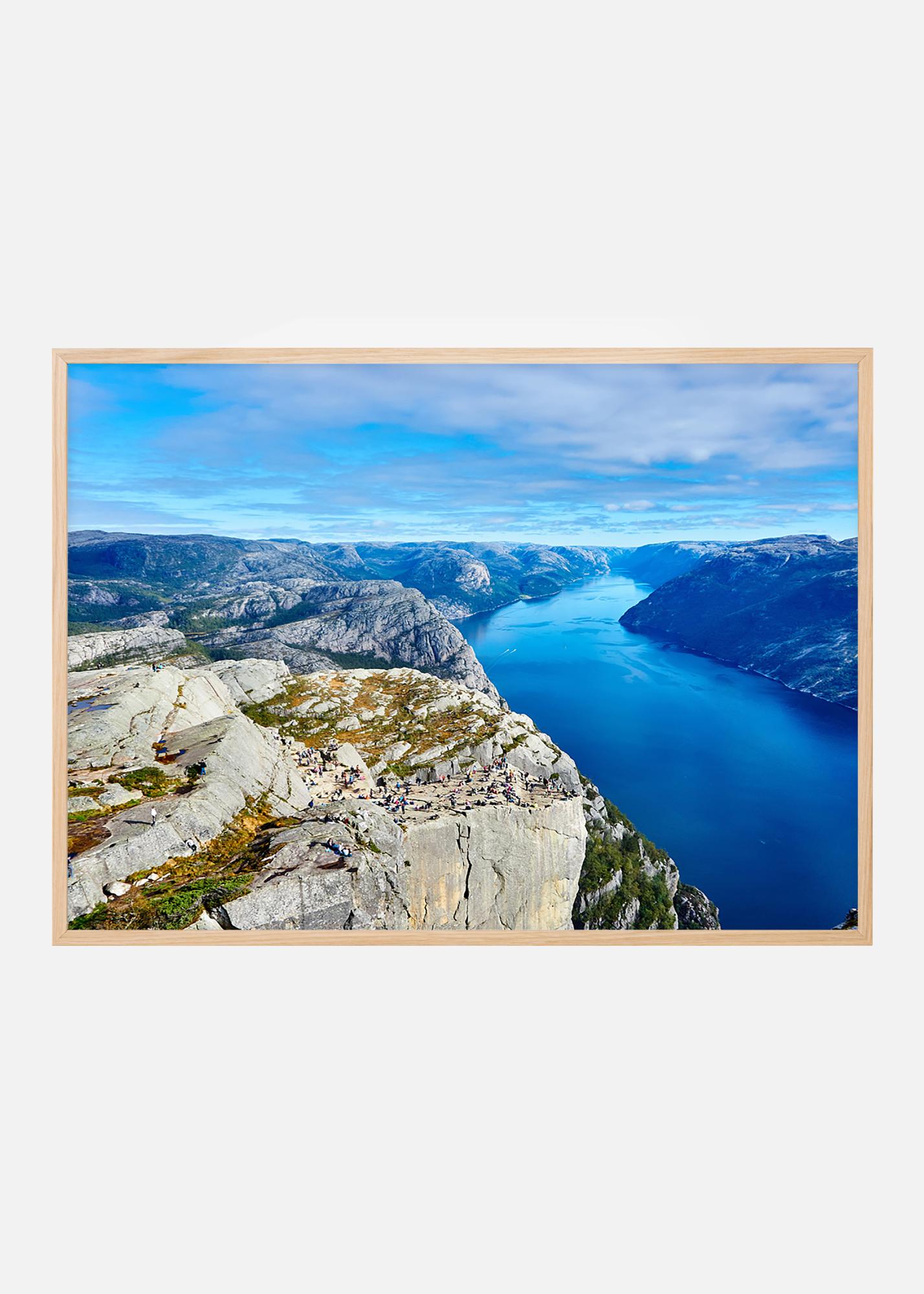 Fotografie mit atemberaubender Aussicht über ein tiefes Fjordtal. Das Poster ist in ozeanblauen Tönen gehalten mit sonnenbeleuchteten kahlen Felsen auf beiden Seiten des Fjords, eine großartige Landschaft, die an der Wand bei denen passt, die eine schöne Naturszenerie zu schätzen wissen. Ergänzen Sie das Bild mit einem Bilderrahmen, der das Motiv hervorhebt.