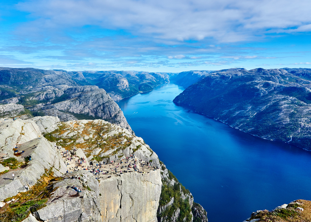 Fotografie mit atemberaubender Aussicht über ein tiefes Fjordtal. Das Poster ist in ozeanblauen Tönen gehalten mit sonnenbeleuchteten kahlen Felsen auf beiden Seiten des Fjords, eine großartige Landschaft, die an der Wand bei denen passt, die eine schöne Naturszenerie zu schätzen wissen. Ergänzen Sie das Bild mit einem Bilderrahmen, der das Motiv hervorhebt.