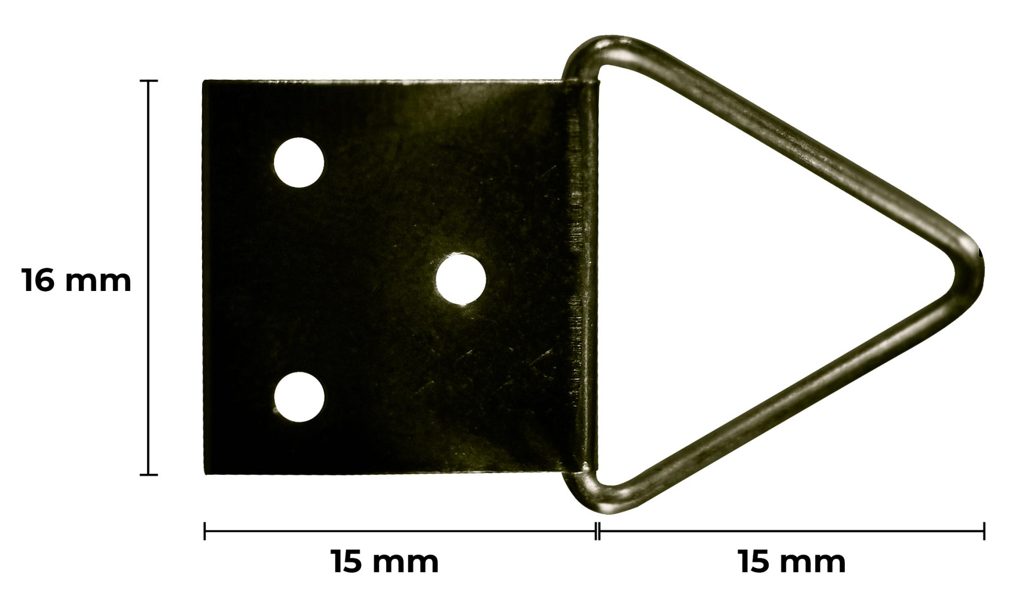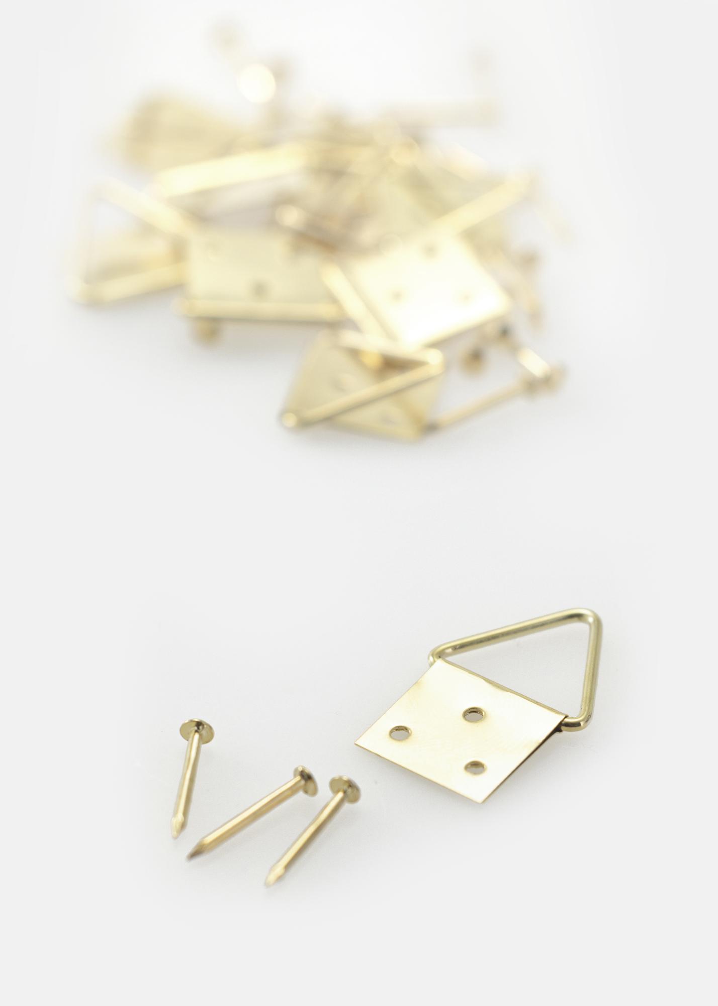 Dreiecksaufhänger aus Messing, die an die Rückwand des Rahmens genagelt werden. Es kann ein Aufhänger alleine verwendet werden oder zwei, wenn du Bilderdraht verwenden möchtest. Dieser Aufhänger ist ideal für etwas größere Gemälde (maximale Größe: 60x90 cm)