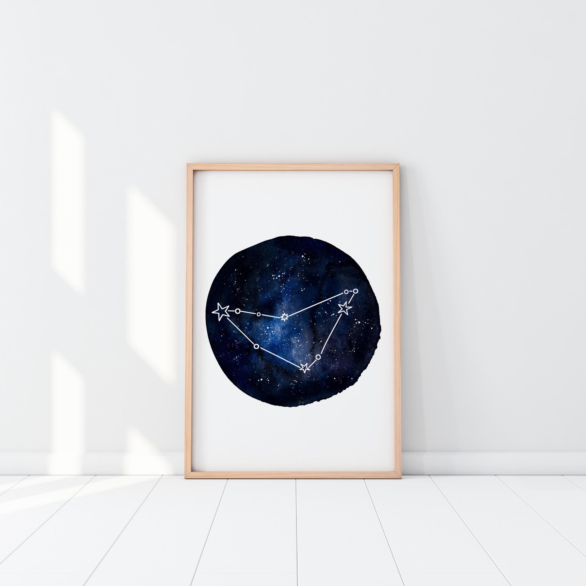 Ein Horoskop-Poster für Steinbock. Ein dunkelblauer Kreis befindet sich in der Mitte eines weißen Hintergrunds. In dem Kreis sind verschiedene Blautöne und Sterne zu sehen. Die Hauptkonstellation ist das Tierkreiszeichen Steinbock. Nehmen Sie dieses Poster und hängen Sie es auf, wenn Sie Ihr Sternzeichen mögen.