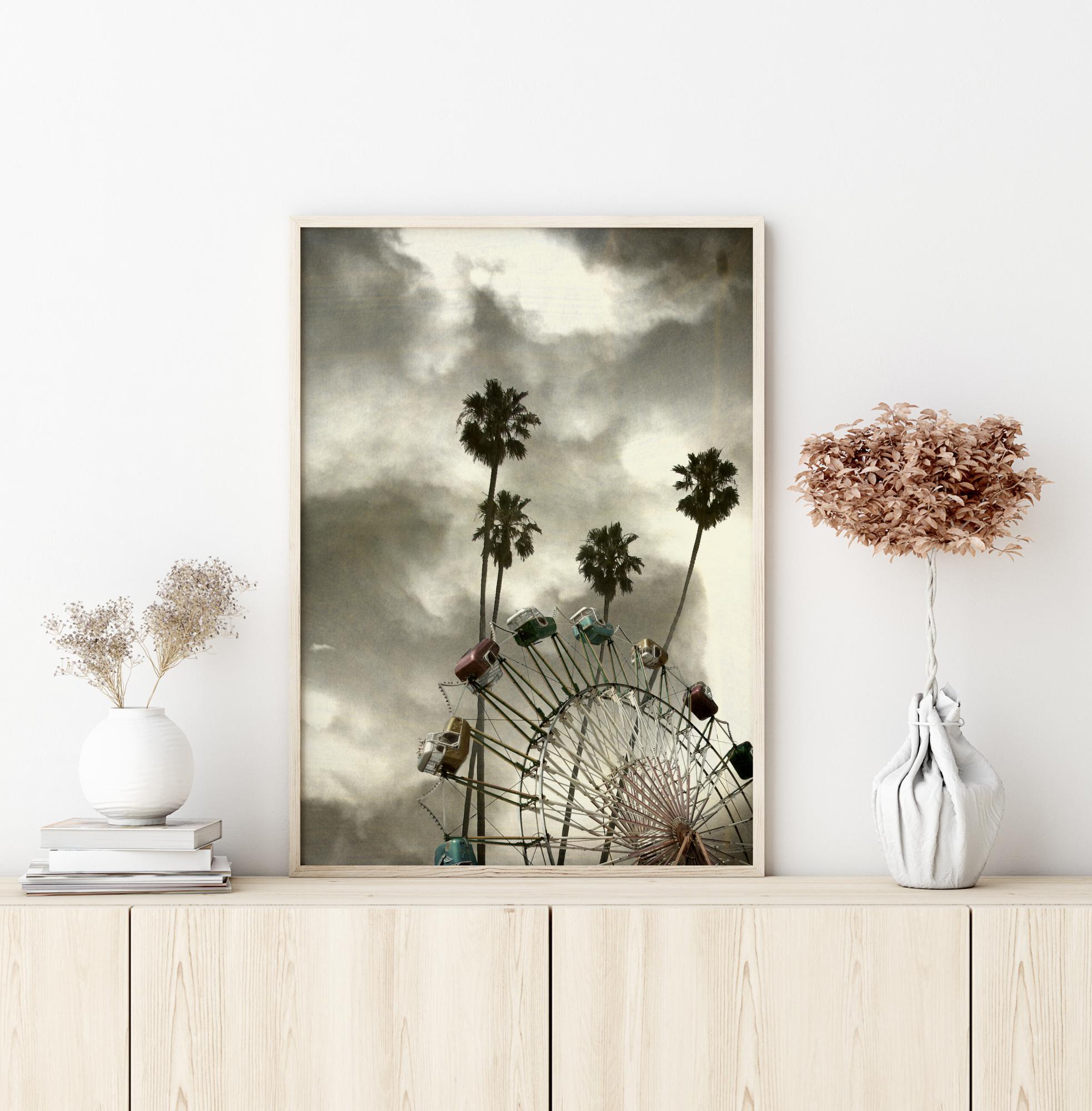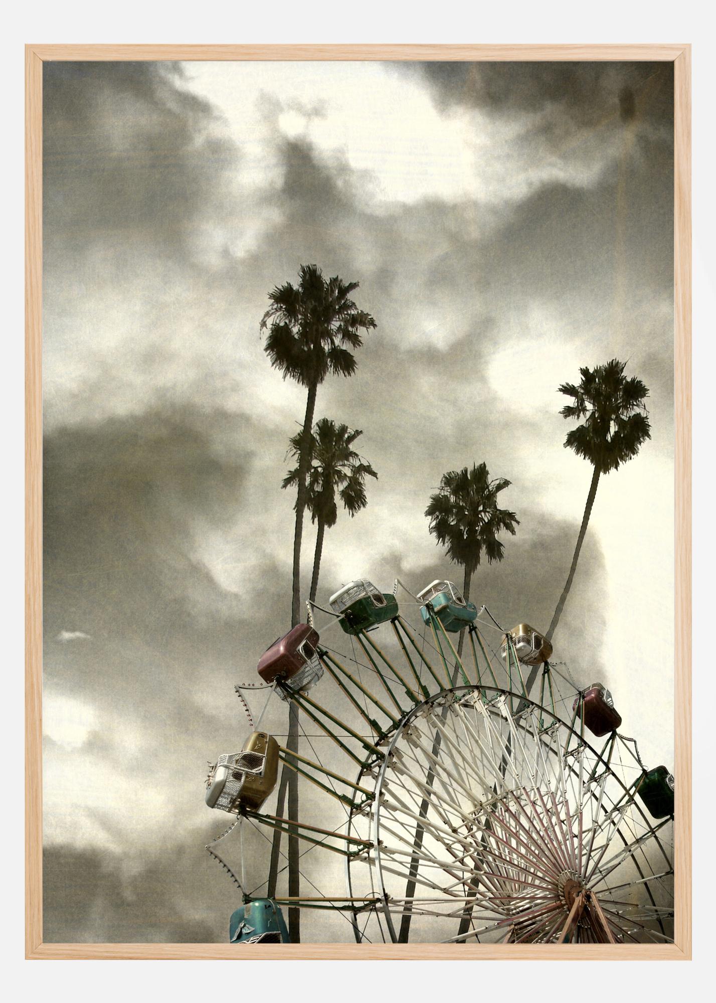 Eine fotografische poster über ein Riesenrad-ähnliche Karussell mit Wagen in herrlichen Pastelltönen vor einem Hintergrund aus Palmen und einem dramatischen Himmel. Ein schönes poster mit viel Gefühl.