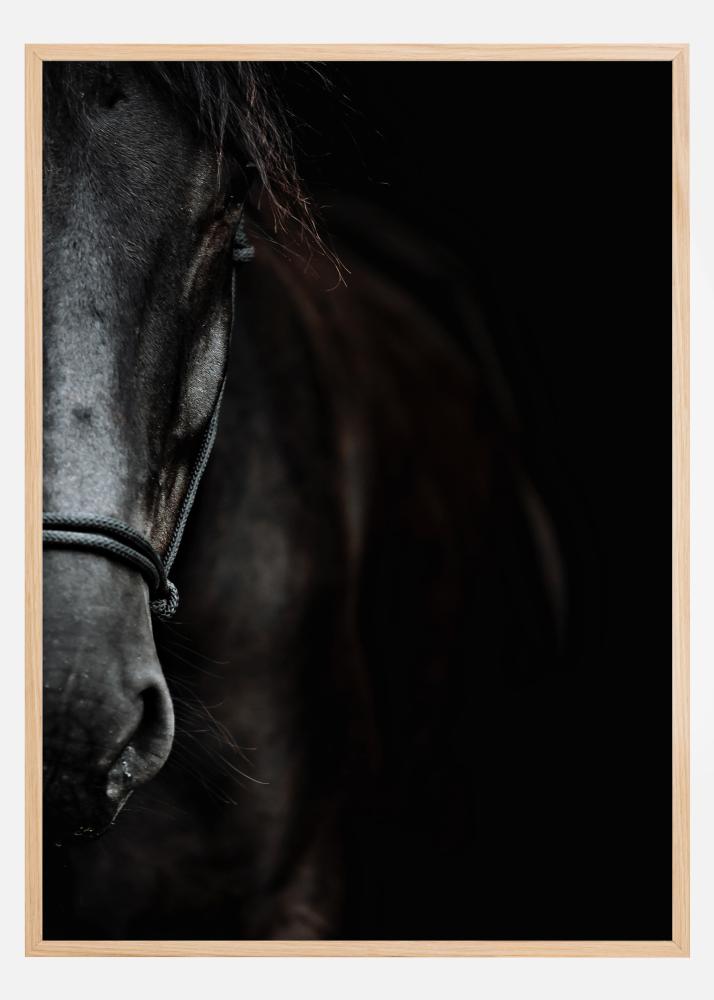 Ein fotografisches Poster für den Pferdeliebhaber! Hier ist ein dunkles Pferd, frontal fotografiert gegen einen dunklen Hintergrund. Das Gesicht ist schön beleuchtet, während die hinteren Teile des Pferdes im Hintergrund verschmelzen. Ergänzen Sie gerne mit etwas aus unserem großen Sortiment an Bilderrahmen.