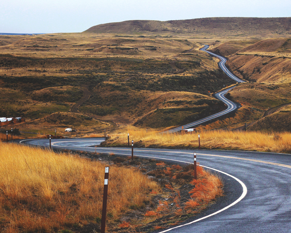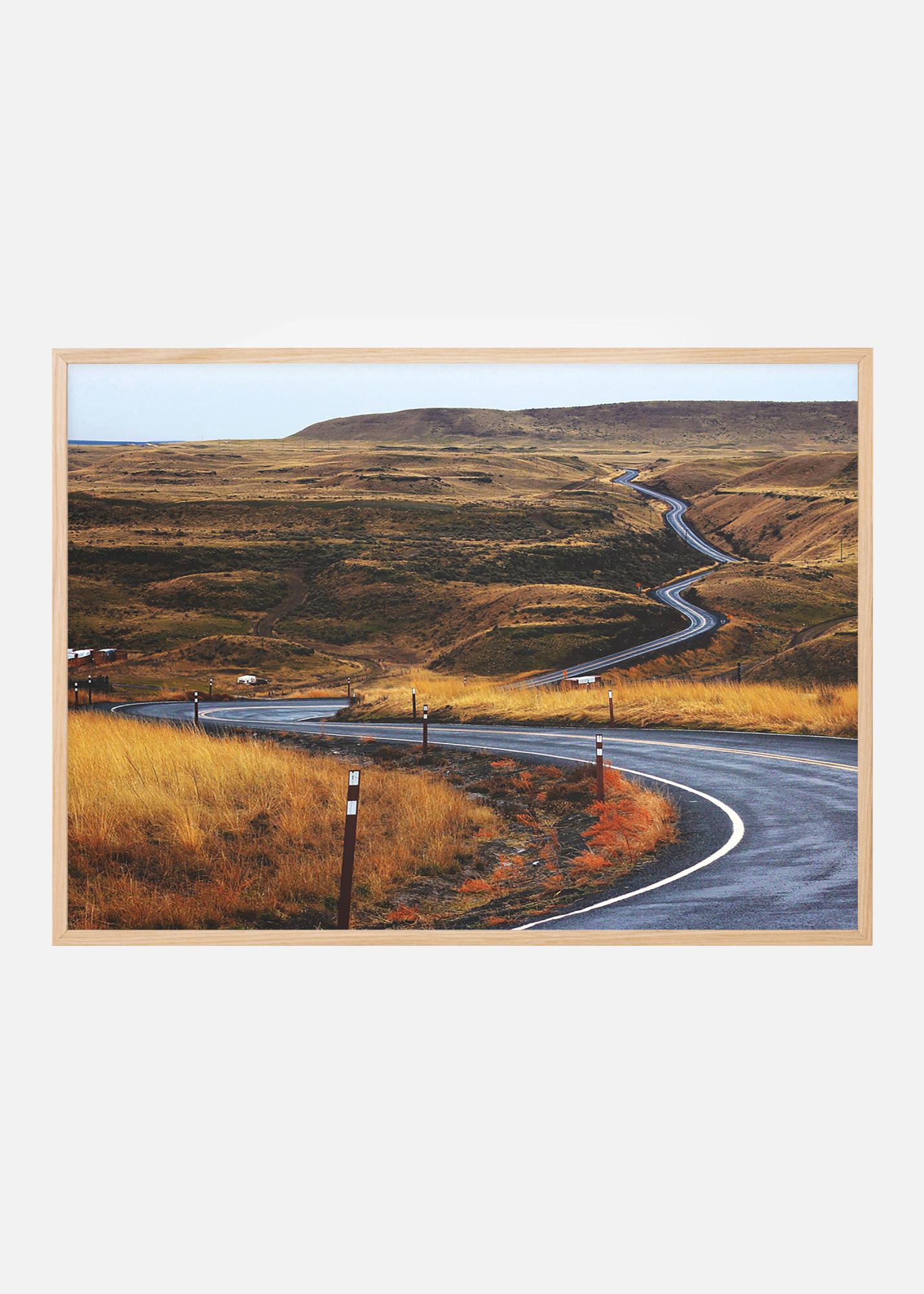Poster mit einer Asphaltstraße, die sich durch eine sonnenverbrannte Steppe schlängelt. Die gelbbraunen Grasnuancen gegen die kalte Oberfläche des Asphalts, die sich durch die offene Landschaft bricht, ziehen den Blick in das Bild und folgen der Straße. Das Plakat passt gut in einen minimalistischen Rahmen, in dem das Motiv zur Geltung kommt und kann gerne mit anderen Bildern zu einem Thema kombiniert werden.