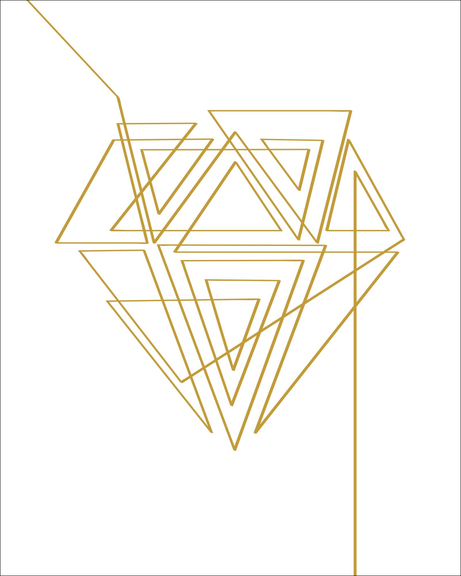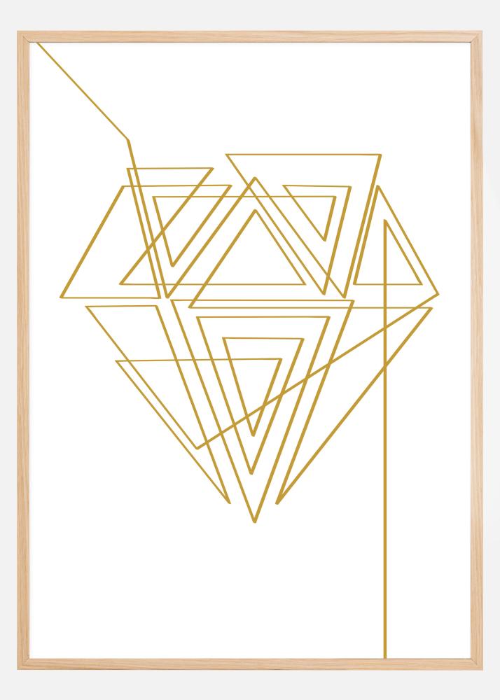 Ein abstraktes Poster eines Diamanten, der aus geometrischen goldenen Linien besteht. Dieser Diamant besteht aus verschiedenen Dreiecksformen, die jedoch alle in einer langen, ununterbrochenen Linie angeordnet sind. Folgen Sie der Linie und versuchen Sie, das komplette Muster zu enträtseln. Auf weißem Hintergrund wirkt es am besten auf einer creme- oder goldfarbenen Wand.