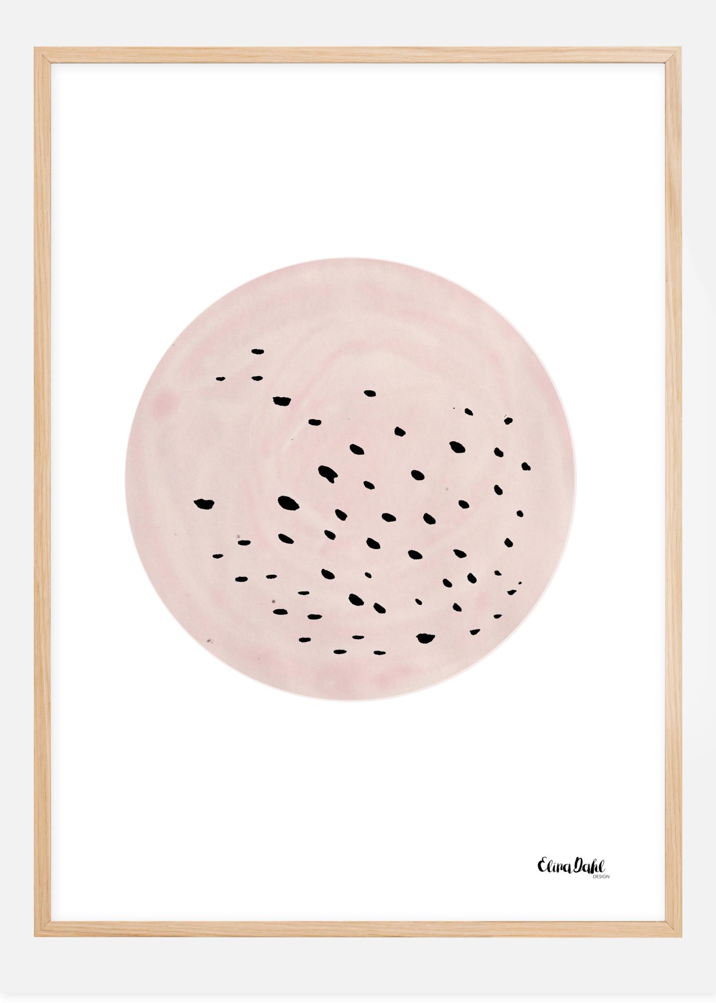 Ein abstraktes Poster mit schwarzen Punkten in einem rosa-beigefarbenen Kreis. Das ins Rosa neigende Beige dieses Kreises ist mit kleinen Punkten gefüllt, die die Oberfläche besprenkeln. Die Kugel ist auf einem schlichten weißen Hintergrund aufgehängt. Kombinieren Sie dieses seltsame, aber fesselnde Bild mit einem kräftigen, intensiven Hintergrund für ein wirklich interessantes Kunstwerk.
