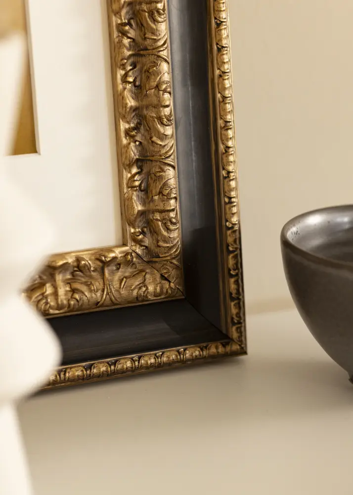 "Drottningholm Gold" ist ein wunderschöner, handbemalter Retro-Rahmen aus Italien, hergestellt aus Kiefernholz und mit Fingerzinkung. Der Bilderrahmen hat ein reich verziertes Goldprofil mit einem breiten schwarzen Rand, wodurch ein eleganter Eindruck erzeugt wird. Perfekt für alle Arten von Einrahmungen im Retro-Stil.