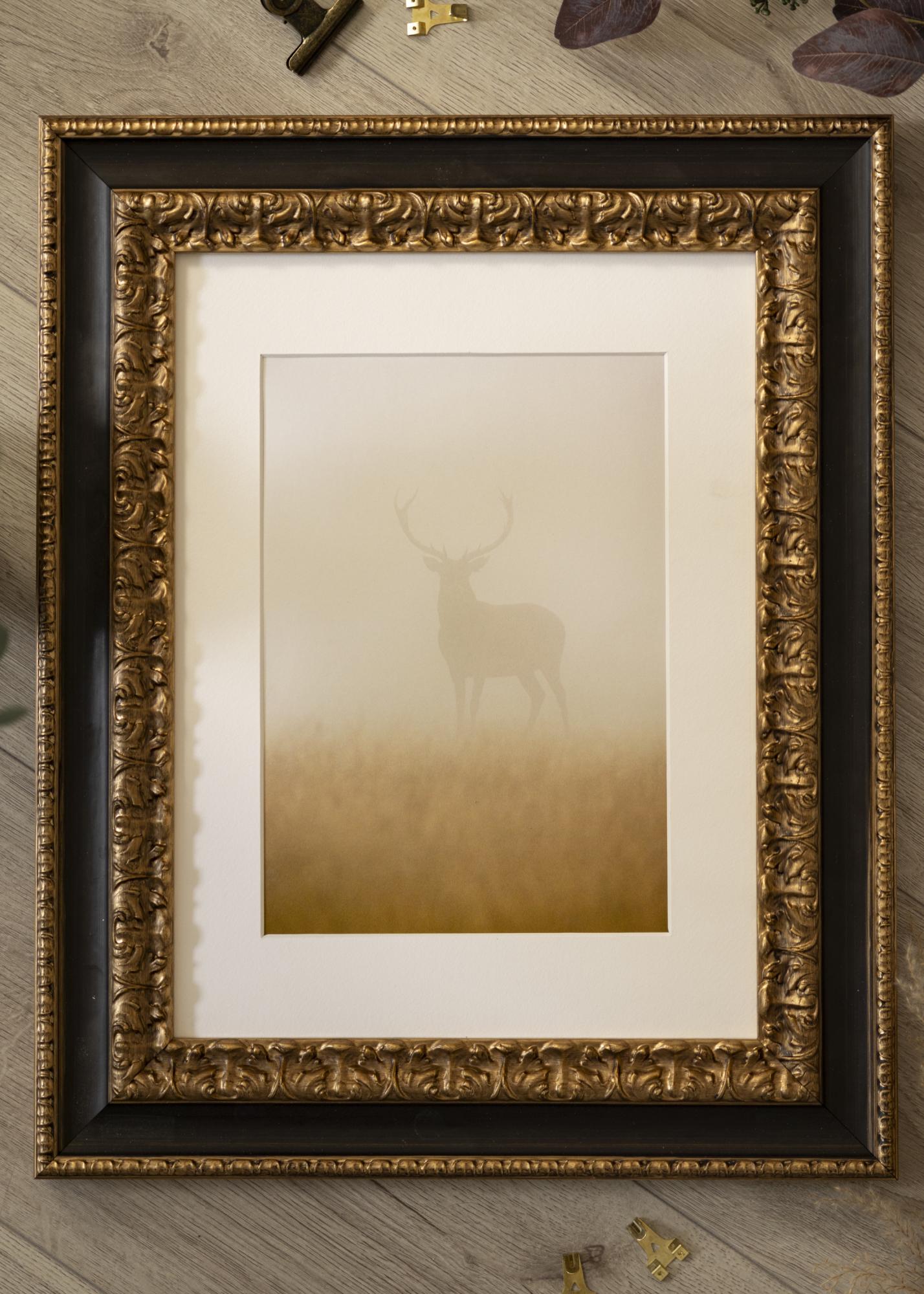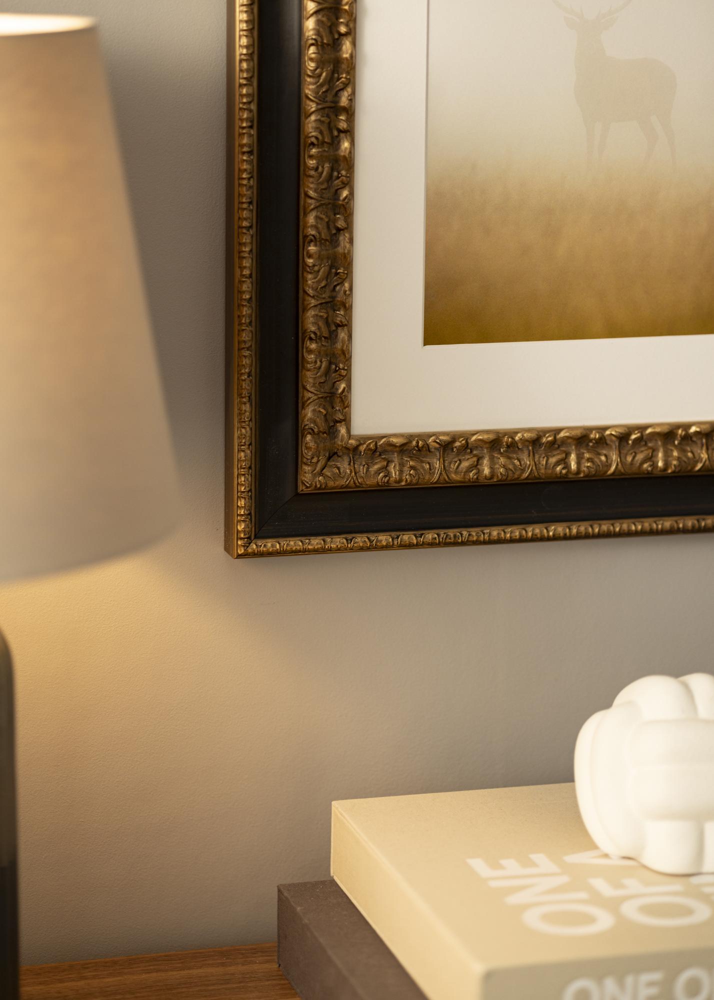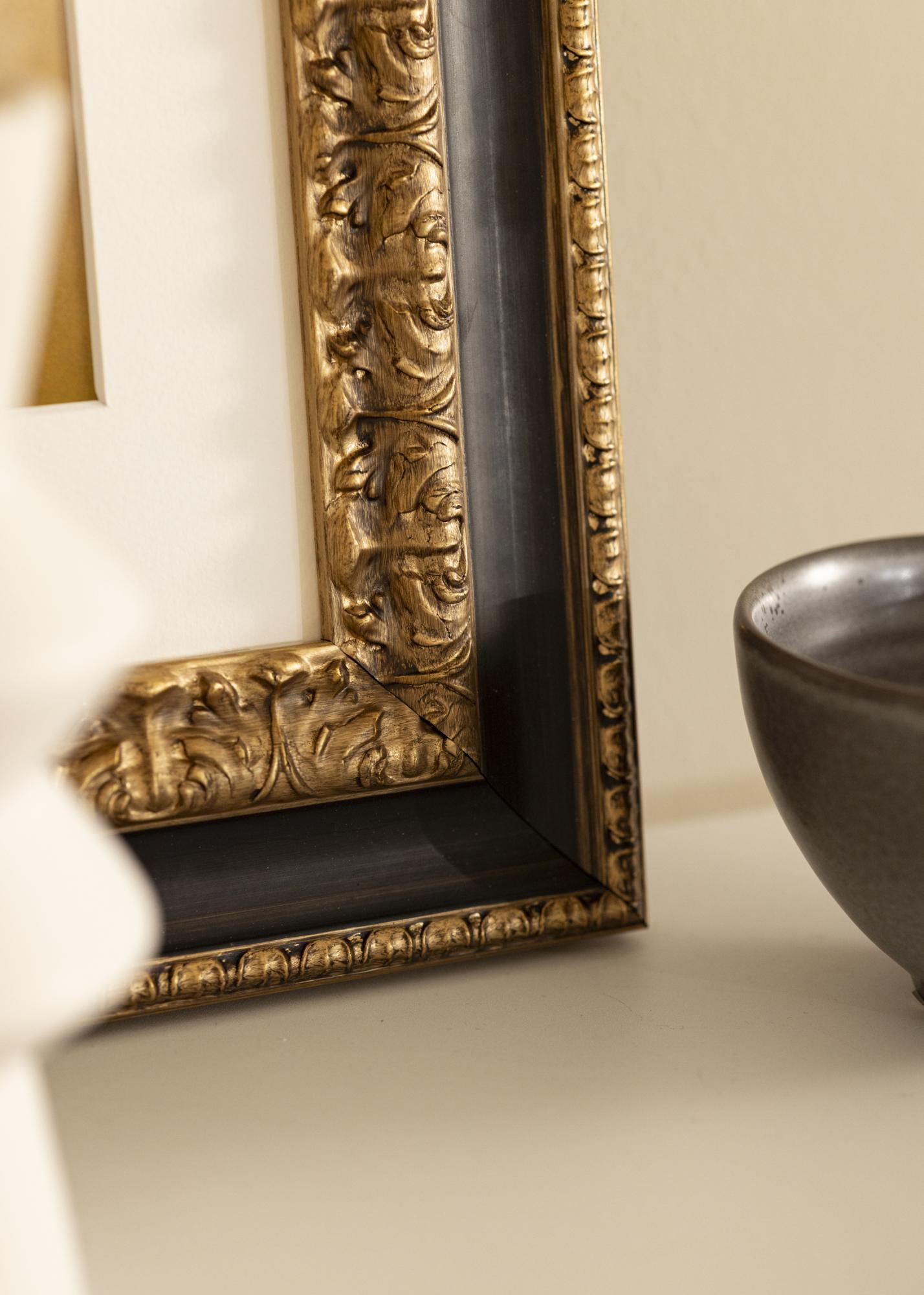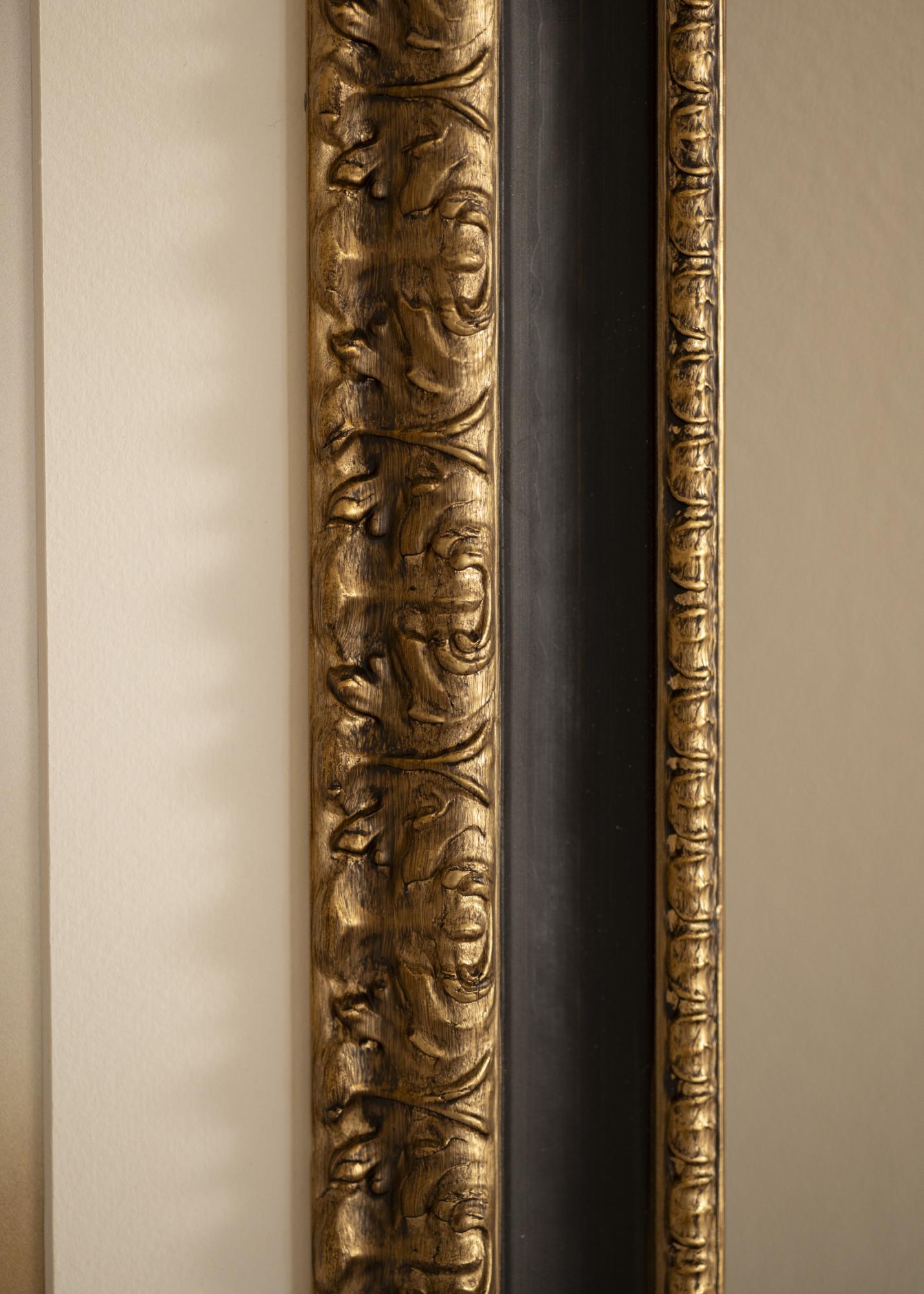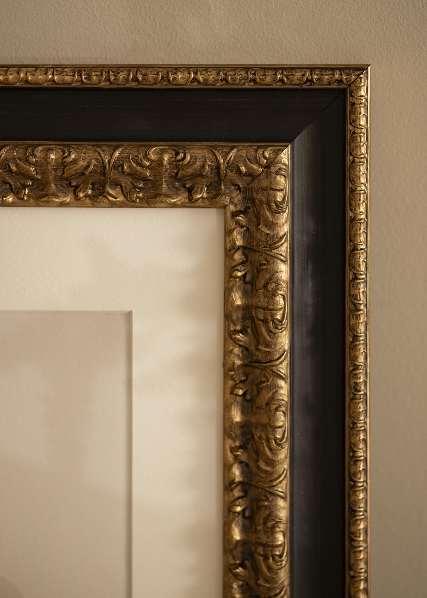"Drottningholm Gold" ist ein wunderschöner, handbemalter Retro-Rahmen aus Italien, hergestellt aus Kiefernholz und mit Fingerzinkung. Der Bilderrahmen hat ein reich verziertes Goldprofil mit einem breiten schwarzen Rand, wodurch ein eleganter Eindruck erzeugt wird. Perfekt für alle Arten von Einrahmungen im Retro-Stil.