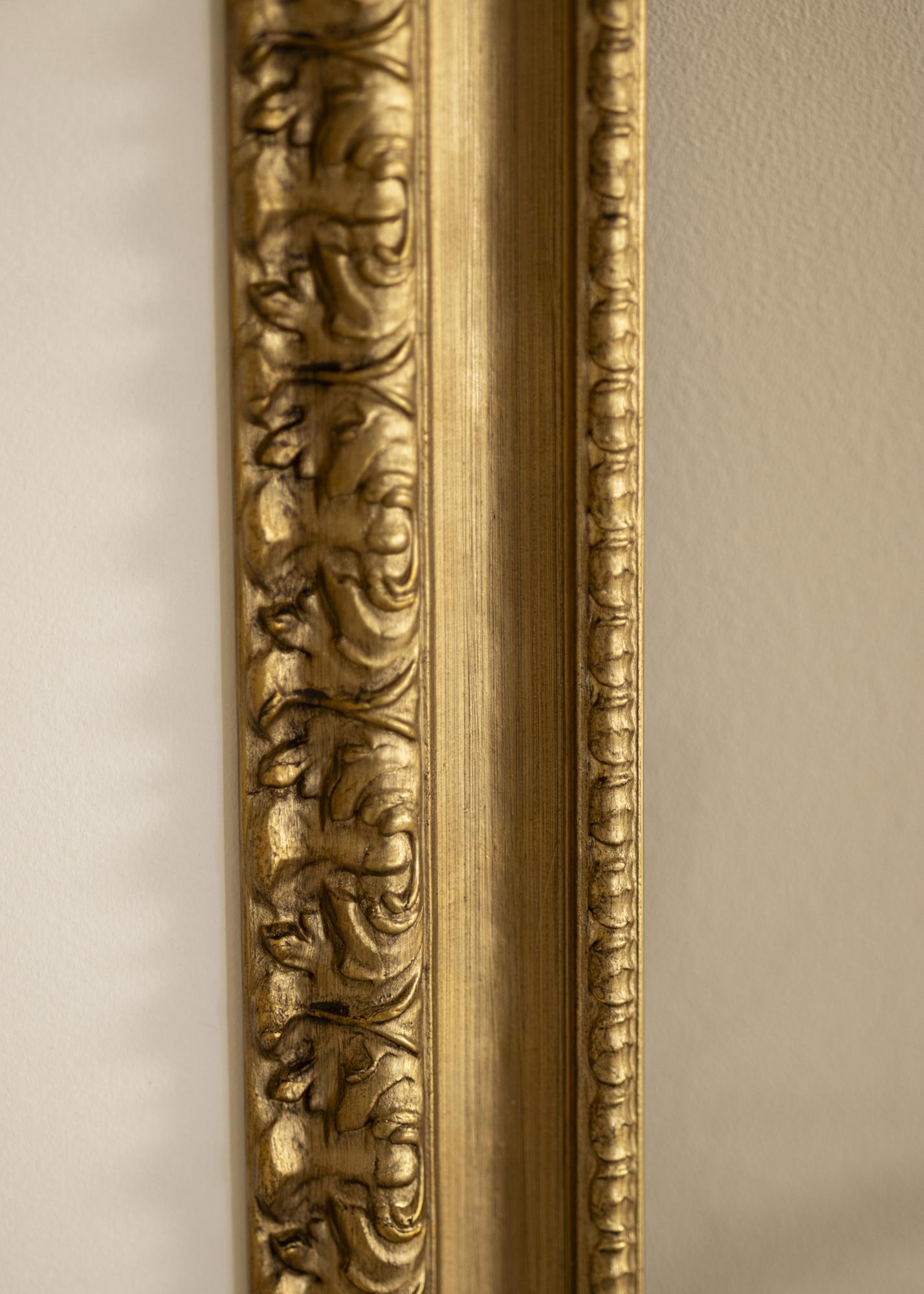 Rahmen Drottningholm Gold III ist ein eleganter und stilvoller Fotorahmen, der Ihren Bildern eine königliche Umrahmung verleiht. Mit seiner goldfarbenen Ausführung und den detaillierten, skulptierten Verzierungen entlang der inneren Kante wird dieser Bilderrahmen zu einer schönen Ergänzung für jeden Raum. Die sanfte Bürstung der Oberfläche hebt das Reliefmuster hervor und verleiht dem Rahmen einen leicht gealterten Charakter, der ein Gefühl zeitloser Eleganz schafft.