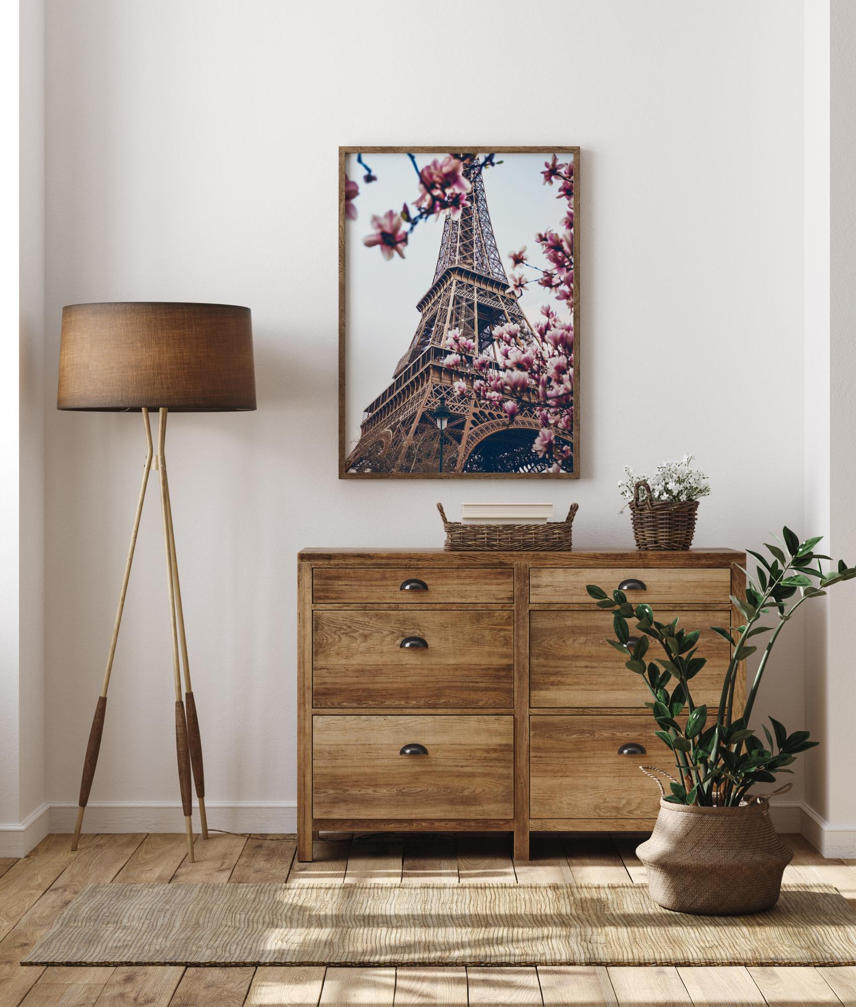 Ein beruhigendes Kunstfoto des Eiffelturms, bei dem die schönen Magnolien im Vordergrund ein herrliches schimmerndes Licht und eine schöne Tiefe zum Bild beitragen. Ein romantischer poster, der leicht mit anderen Favoriten kombiniert werden kann.
