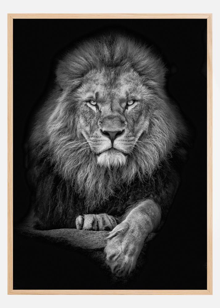 Ein schwarz-weißes Nahaufnahmefoto eines Löwen, der direkt den Betrachter anschaut. Der dunkle Hintergrund und der intensive Blick schaffen eine wunderbare Anziehungskraft zum Bild. Dies ist ein Poster, das sich sowohl alleine als auch zusammen mit anderen Favoriten in einem größeren Collage hervorragend macht.