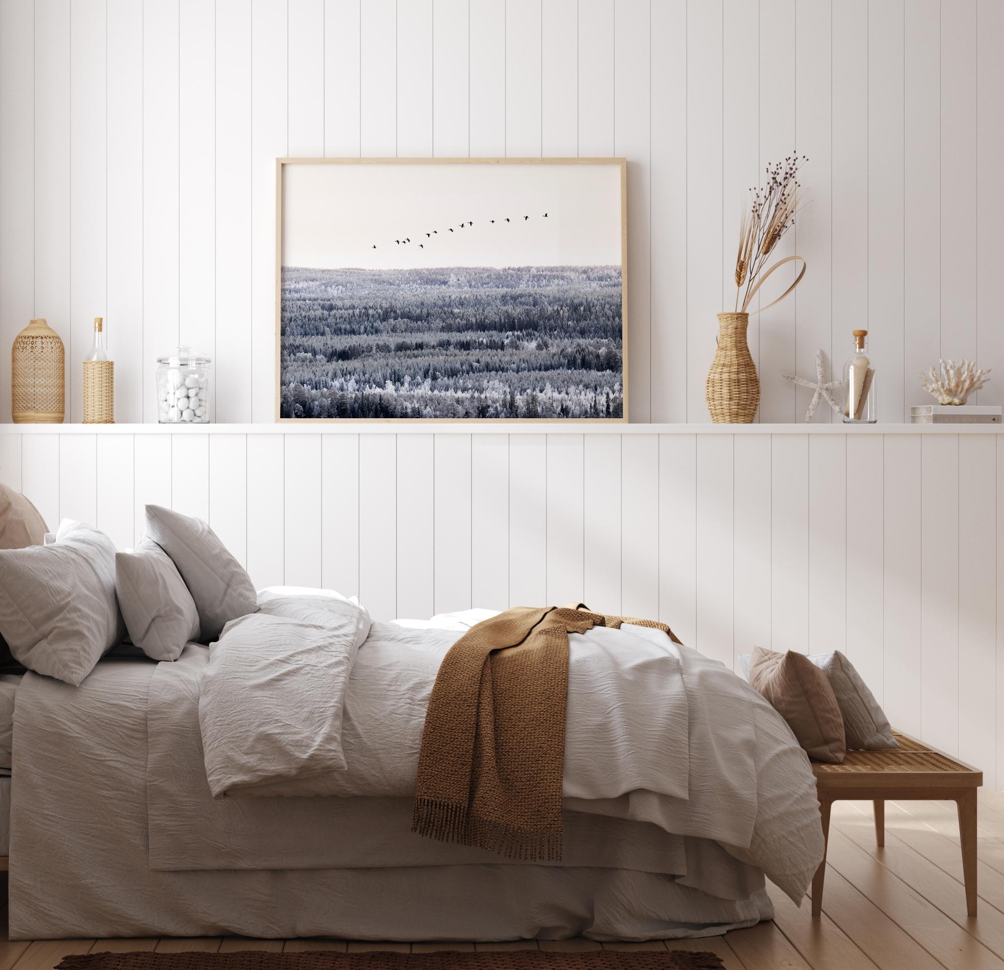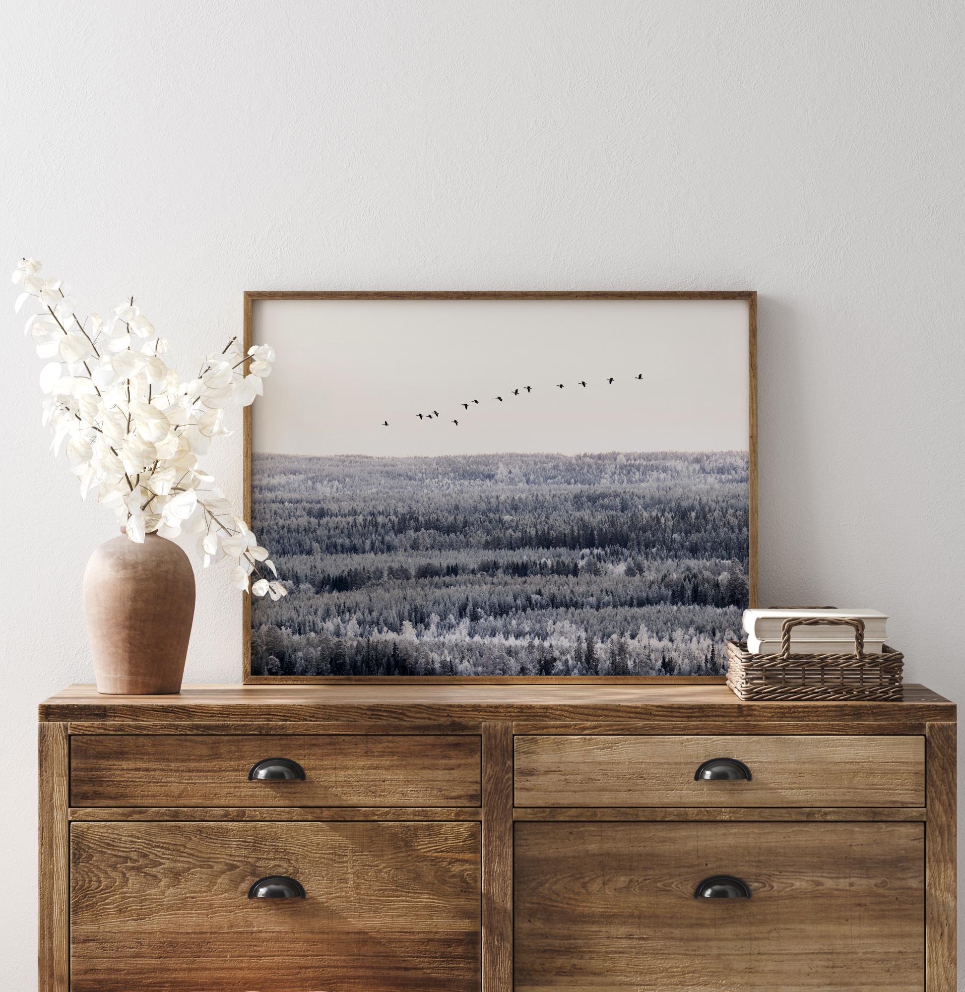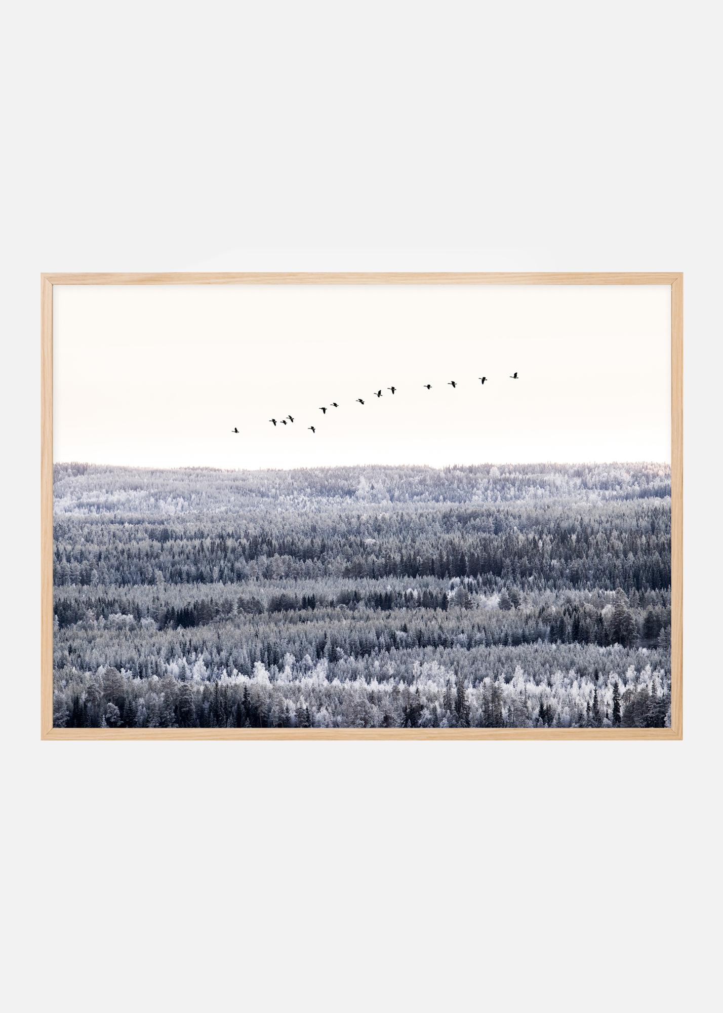 Ein fotografisches Poster über einen Schwarm von Zugvögeln, die hoch über den Baumwipfeln fliegen. Der weite Wald erstreckt sich in kühlen Farbtönen unter einem weißen Himmel. Ein Poster, das ein herrliches Gefühl von Freiheit vermittelt.