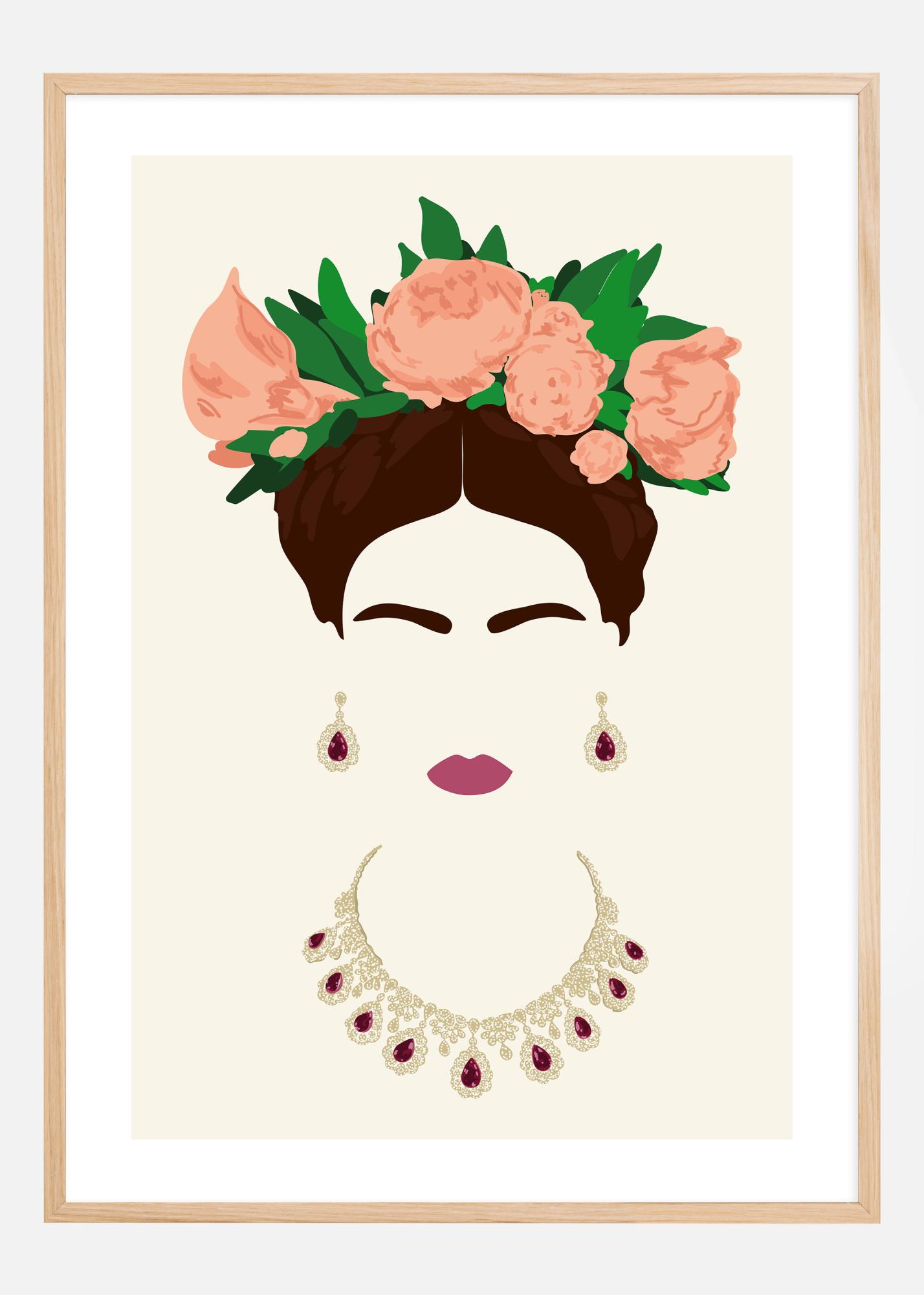 Dieses markante Poster zeigt eine stilisierte Frauenfigur geschmückt mit einer reichen Flora und eleganten Schmuckstücken. Das Motiv stellt eine harmonische Komposition von dunkelbraunem Haar, cremefarbener Haut und einem strahlenden Kranz aus korallenrosa Blumen ergänzt mit dunkelgrünen Blättern dar. Ihre Gesichtszüge sind auf minimalistische Formen reduziert, was ein modernes Gefühl vermittelt.