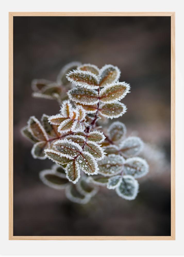 Fotografische Kunst von frostbissen Rosenblättern gegen einen gedämpften Hintergrund. Die roten Adern der Blätter, grüne Farbe und weiße Eiskristalle schaffen feine Kontraste und ein herrliches Leben. Ein botanisches poster, das zu den meisten Häusern und Einrichtungsstilen passt.