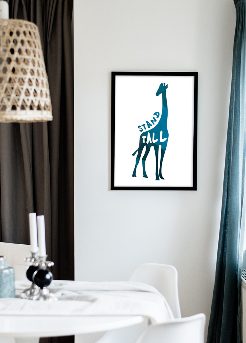 Poster blau wie die Zunge einer Giraffe oder in diesem Fall ist es die ganze Giraffe, die die Farbe hat. Der stilisierte print mit dem ermutigenden Text - Stand tall - ist ein schönes Geschenk für jemanden, der manchmal ein wenig Ermutigung braucht, um standhaft zu bleiben. Die grafische Illustration lässt sich gut mit anderen plakat und Bildern an einer Bildwand mit einem Thema kombinieren. Kaufen Sie einen schicken Bilderrahmen dazu, um das poster einzurahmen, der zur restlichen Einrichtung des Hauses passt, um ein ganzheitliches Umfeld zu schaffen.