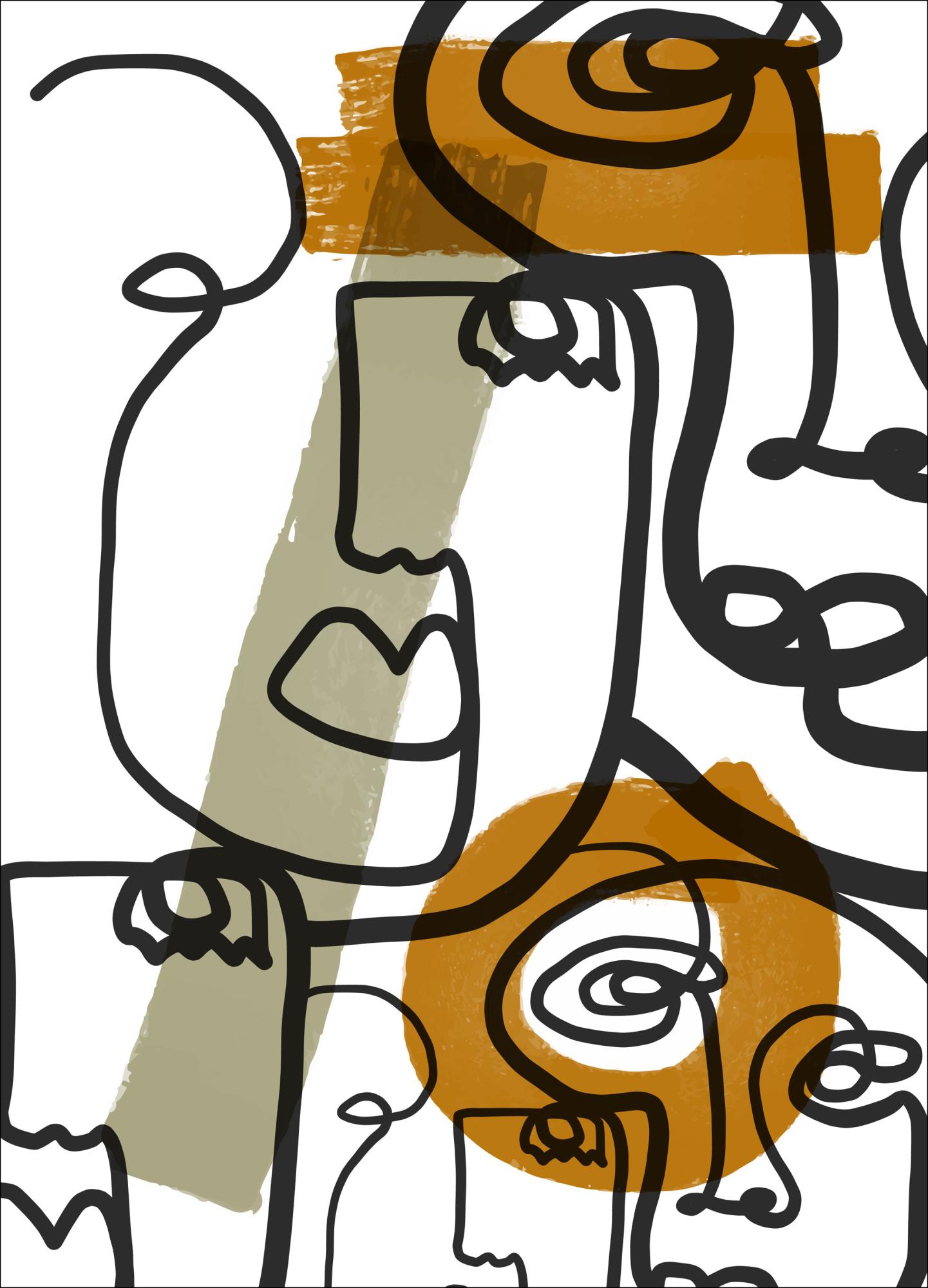 Ein grafischer Linienkunstposter mit Gesichtern in Schwarz vor einem Hintergrund in Weiß, Grau und Braun. Ein abstrakter und lebendiger Poster, der perfekt in das moderne Zuhause passt und sich sowohl in Küche und Flur als auch im Wohnzimmer oder Schlafzimmer gut macht.