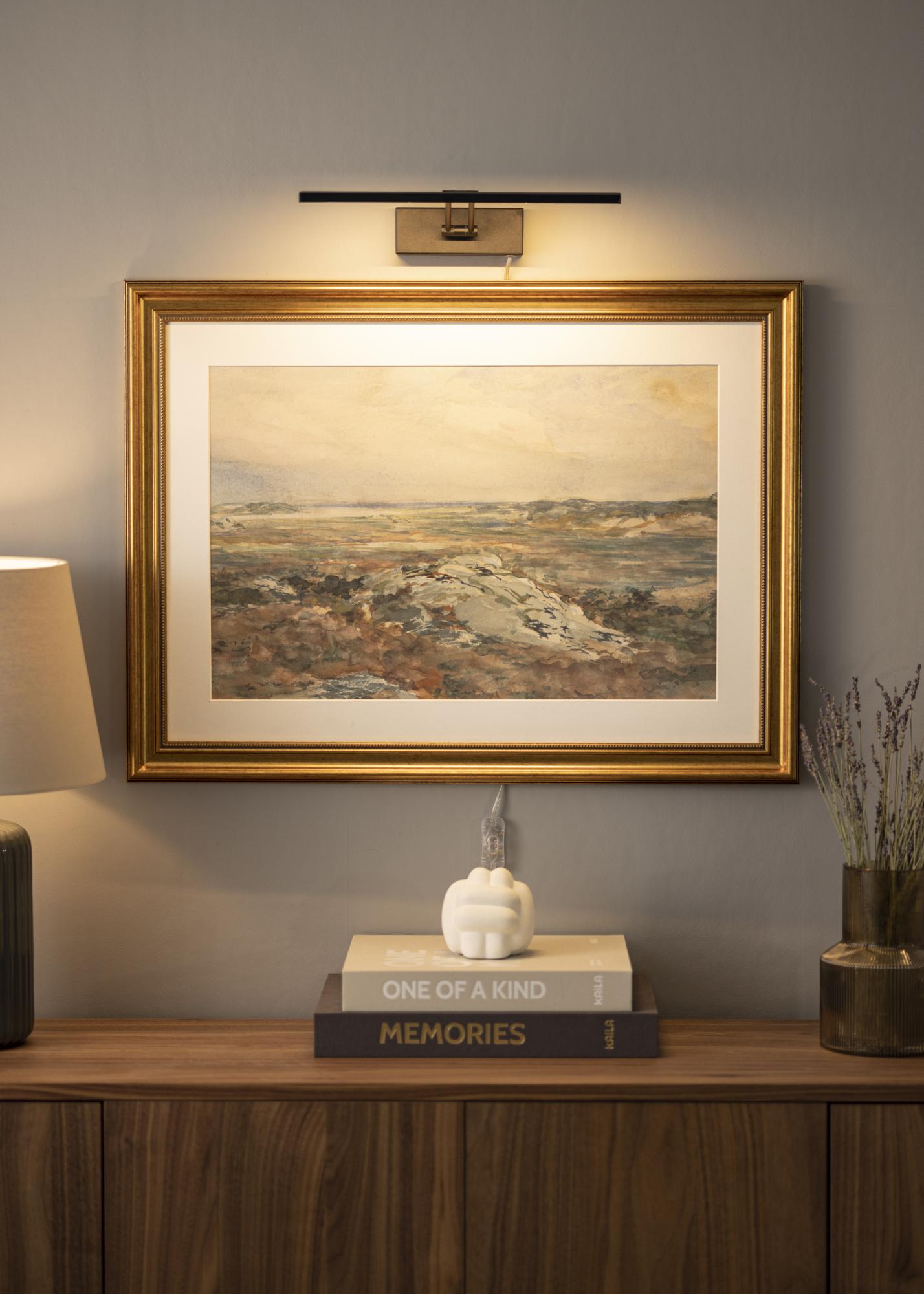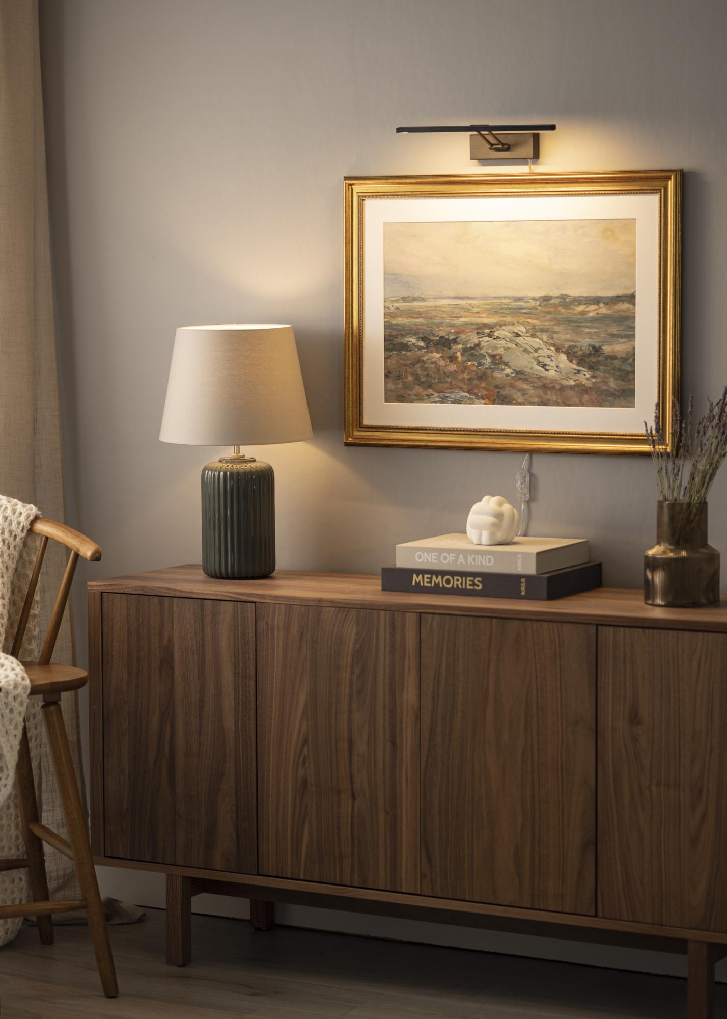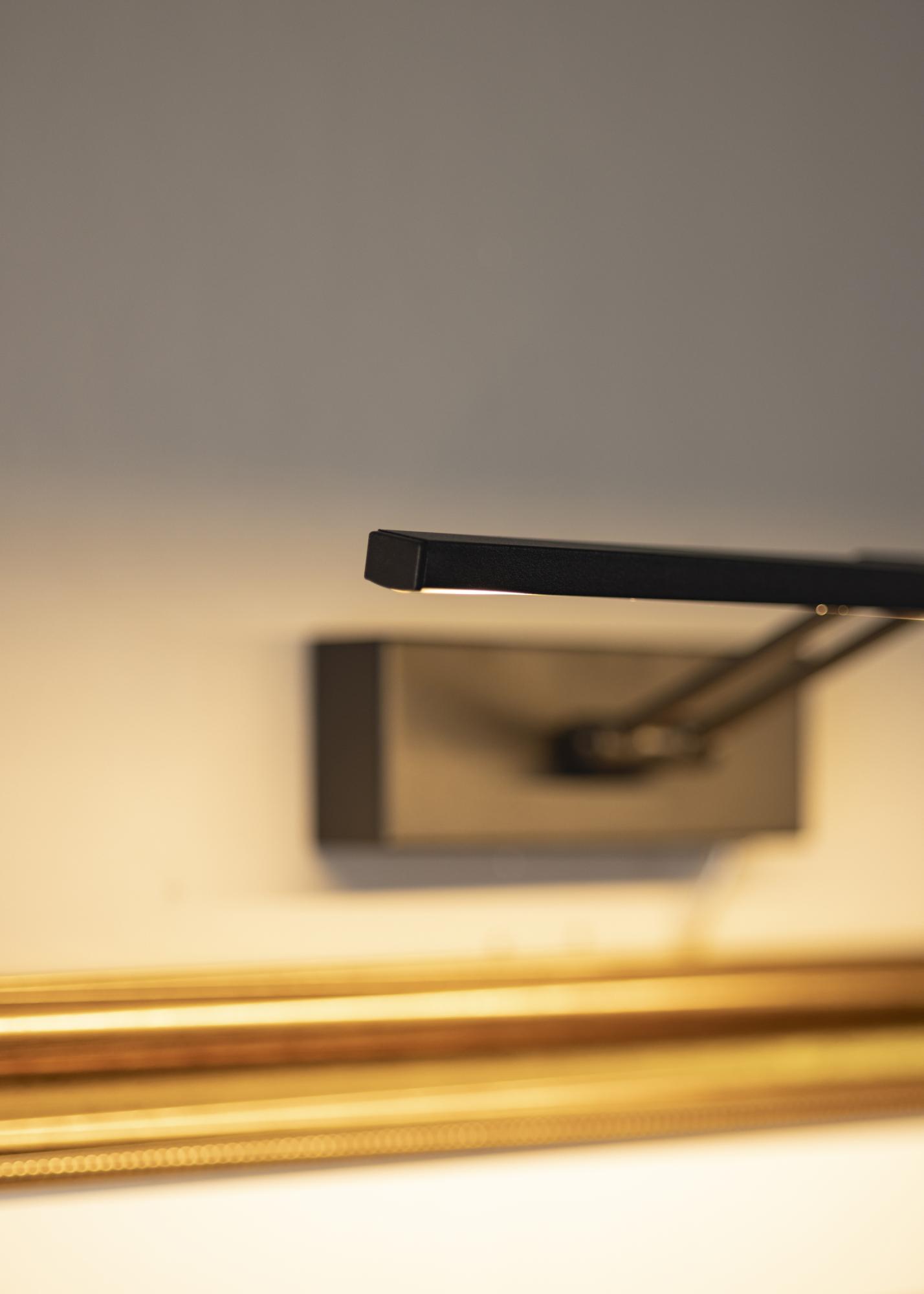 Bildbeleuchtung mn modernen schwedischen Design für Bilder mit einer Breite von 60-100 cm. Die Armatur ist 5 cm hoch und 37 cm lang, mit einem Abstand zur Wand von 20 cm. Mit den 720 Lumen starken LED-Leuchten wird ein angenehmes Licht erzeugt, auch für größere Bilder.