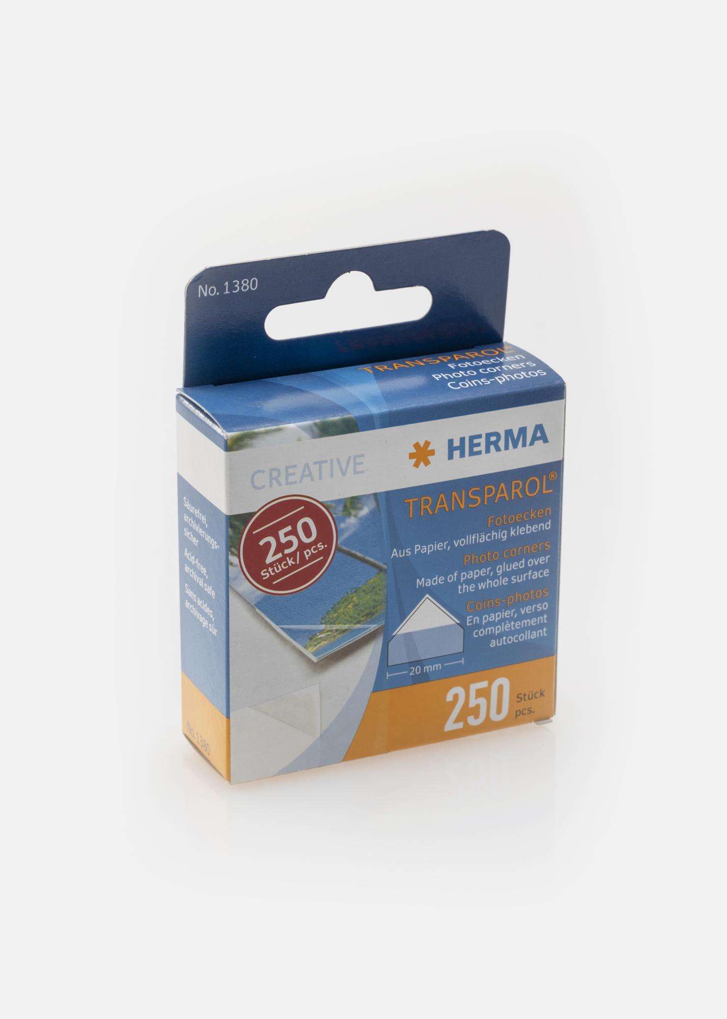 Selbstklebende, durchsichtige Fotoecken von Herma. Jede Packung enthält 250 Fotoecken, die unter anderem dazu benutzt werden, Fotos in Fotoalben zu befestigen. Jede Fotoecke hat eine Breite von 20 mm.