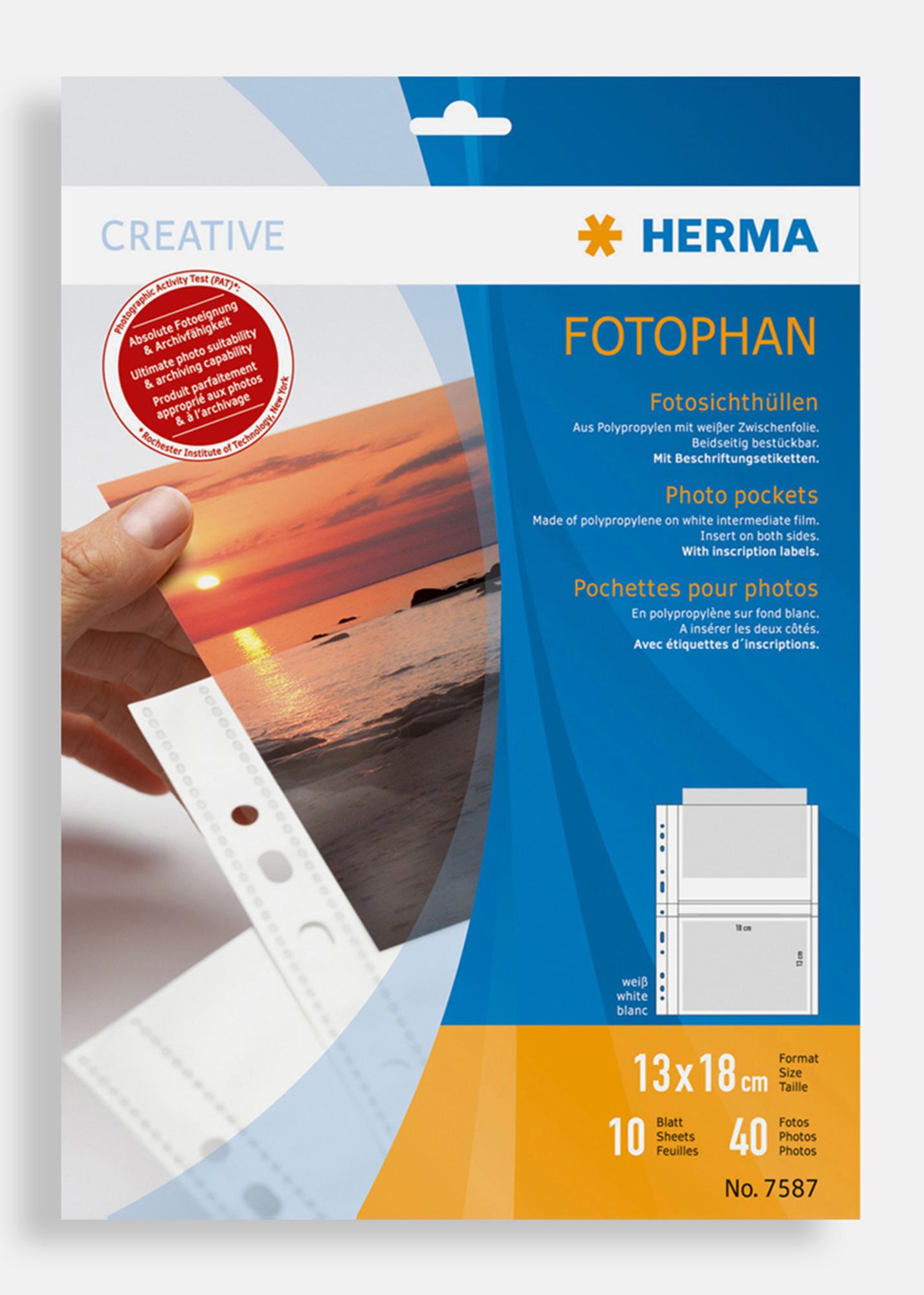 Doppelseitige weiße Fotohüllen für Fotos im Format 13x18 cm (Querformat). Alle Fotohüllen von Herma sind säurefrei und garantiert unschädlich für deine Bilder. Die Fotohüllen sind für Ringordner im Standardformat geeignet. Die Fotohüllen sind PVC-frei.