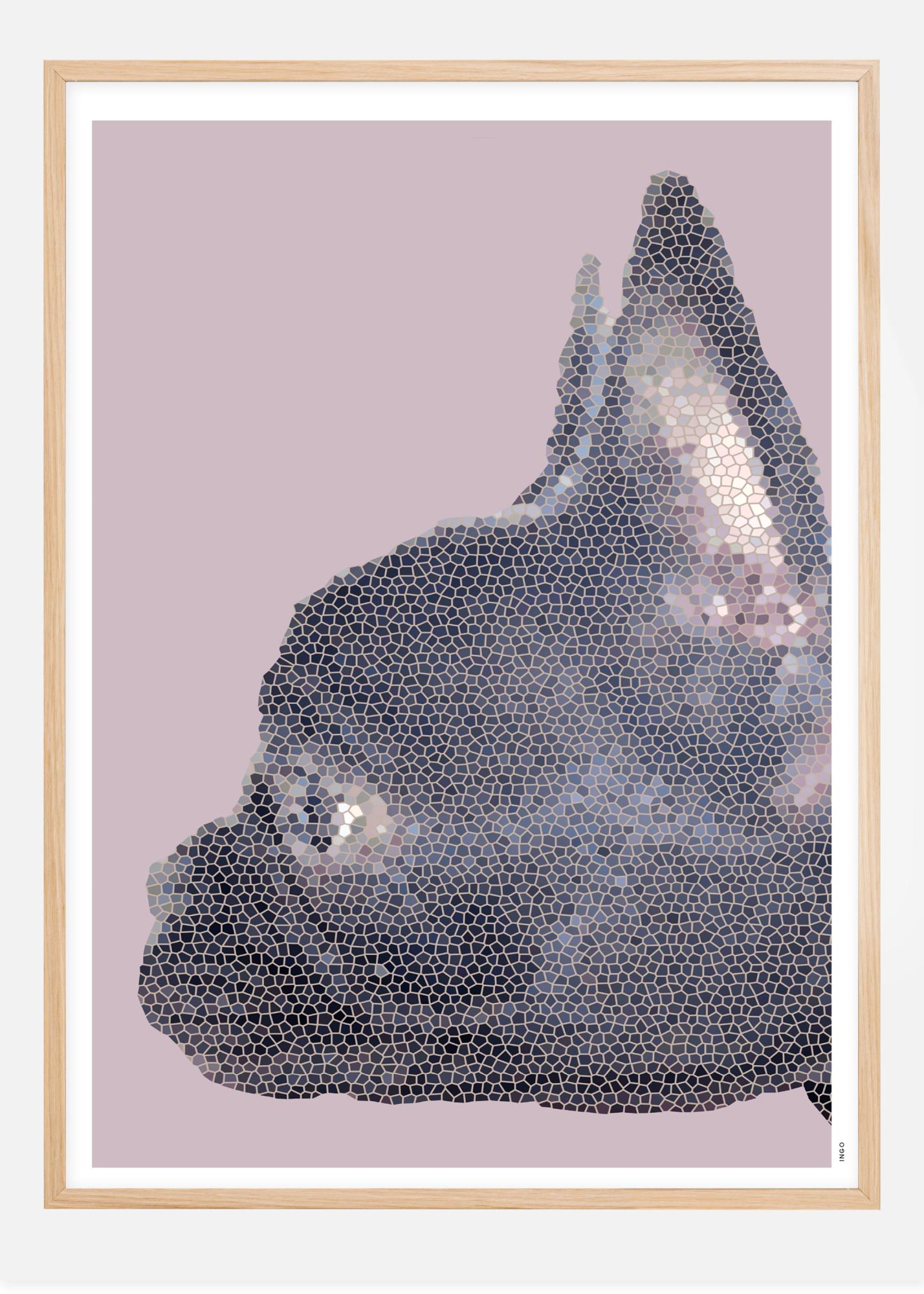 Ein schwarz-weißer Mosaikdruck eines Karlings. Auf einem rosafarbenen Hintergrund spiegelt sich das natürliche Licht in den Ohren und Augen des Hundes. Mit seiner kräftigen Kieferpartie und den aufgestellten Ohren blickt der Hund nach links, als ob er jemanden anschaut. Ein wunderschönes Bild für Tierliebhaber.