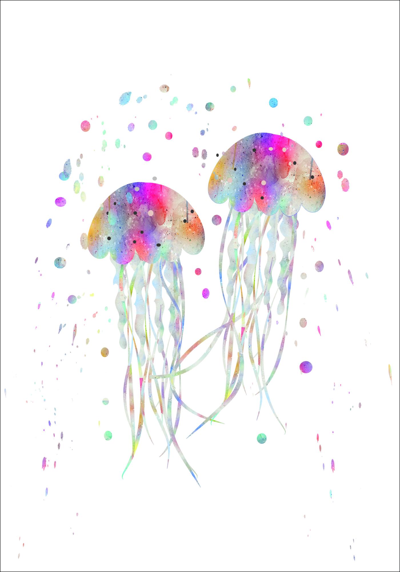 Ein lustiger und kreativer Druck von zwei kleinen, bunten Quallen. Mit ihren bunten Glöckchen und Tentakeln sind sie von bunten Punkten umgeben, die wahllos auf einen weißen Hintergrund gesprenkelt sind. Ein entzückendes Porträt, das jeden Raum in Ihrem Zuhause verschönern wird.
