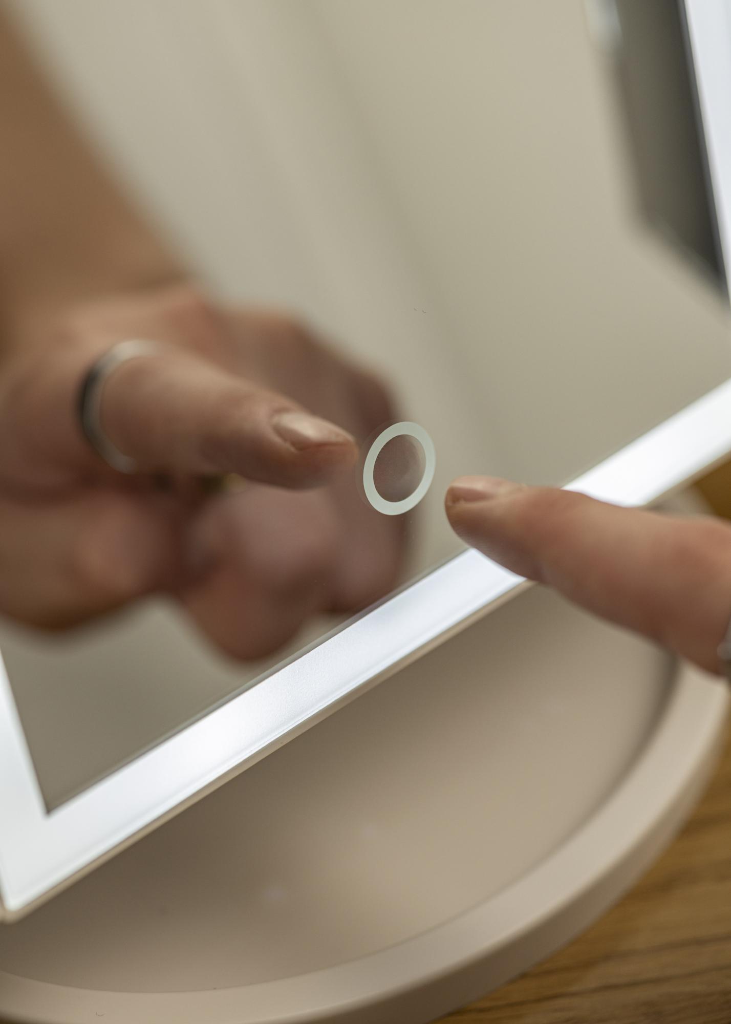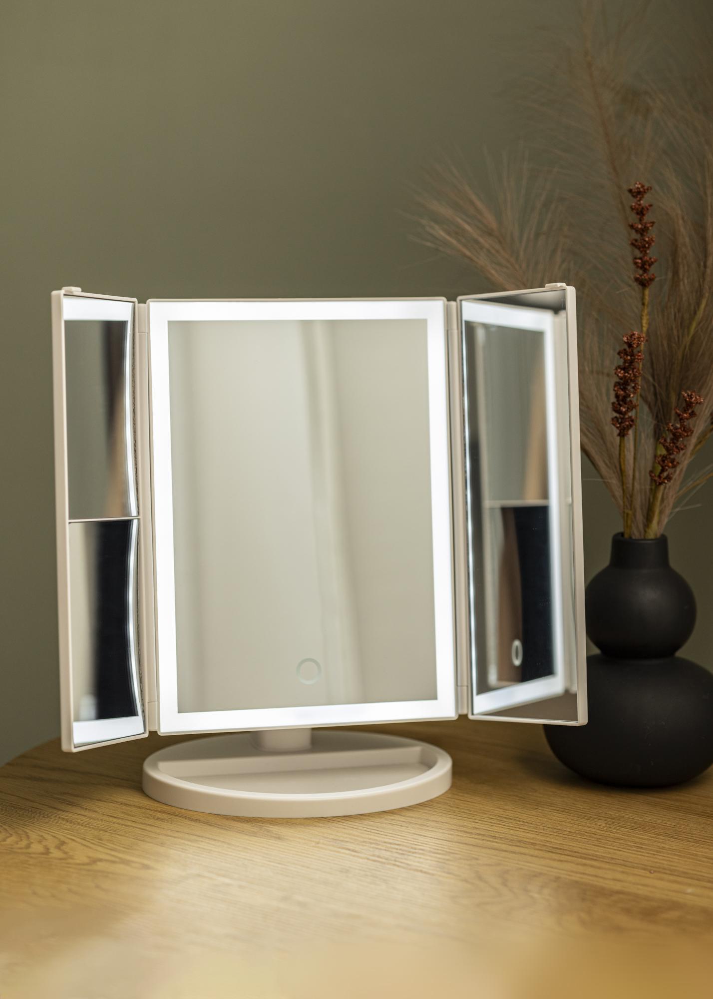 Trendy und ansprechend ist dieser Schminkspiegel mit Standfuß und vier verschiedenen Spiegeln mit dimmbarer LED-Beleuchtung. Die linke Seite des Spiegels bietet eine 2x und 3x Vergrößerung. Die integrierte LED-Beleuchtung rahmt den größeren Teil des Spiegels in der Mitte hübsch ein und strahlt ein warmweißes Licht 3000K ab. Die Beleuchtung wird durch das Drücken des Touch-Sensors einfach eingeschaltet. Indem die Taste mehrere Sekunden lang gedrückt gehalten wird kann gedimmt werden. Der Spiegel besitzt die Maße 38x30 cm und kann in den Winkeln verstellt werden. Einfach und praktisch, um sich aus verschiedenen Positionen betrachten zu können.