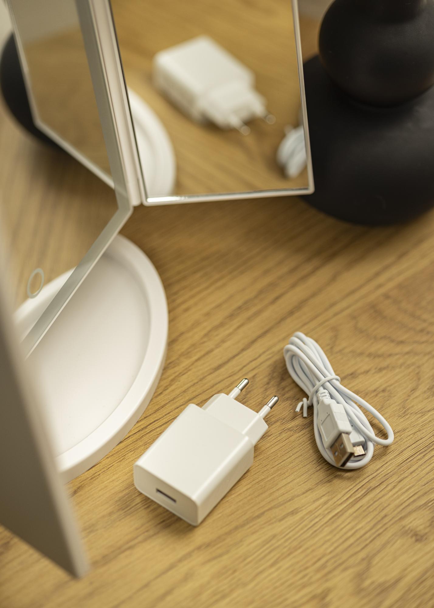 Der Spiegel mit Beleuchtung wird mit 4x AA Batterien betrieben (die Batterien sind nicht im Lieferumfang enthalten) oder kann mit beiliegendem Adapter und USB-Kabel aufgeladen werden.