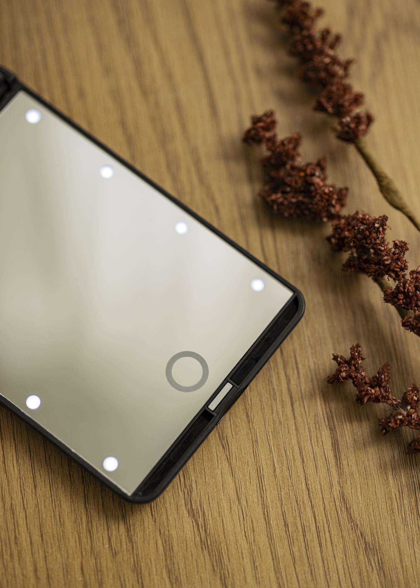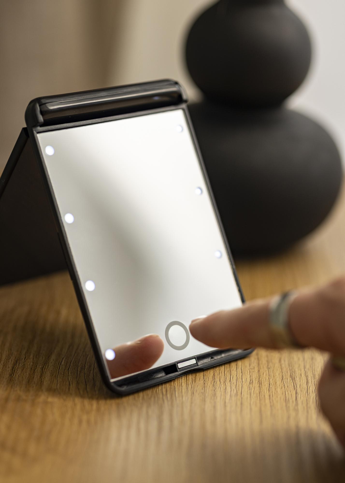 Schöner, klappbarer Kosmetikspiegel für unterwegs oder für die Reise in schwarzem, eleganten Design. Praktischer Taschenspiegel, der immer schnell zur Hand ist, egal wo man sich befindet. Der Taschen-Schminkspiegel verfügt über eine integrierter Beleuchtung rund um das kristallklare Spiegelglas in Form von 8 starken LEDs. Der obere Teil des Spiegel bietet eine 2x Vergößerung. Die LED-Beleuchtung ist dimmbar und leuchtet in einem warmweißen Licht von 3000K. Die gewünschte Lichtstärke kann einfach durch Drücken der Touch-Taste eingestellt werden.