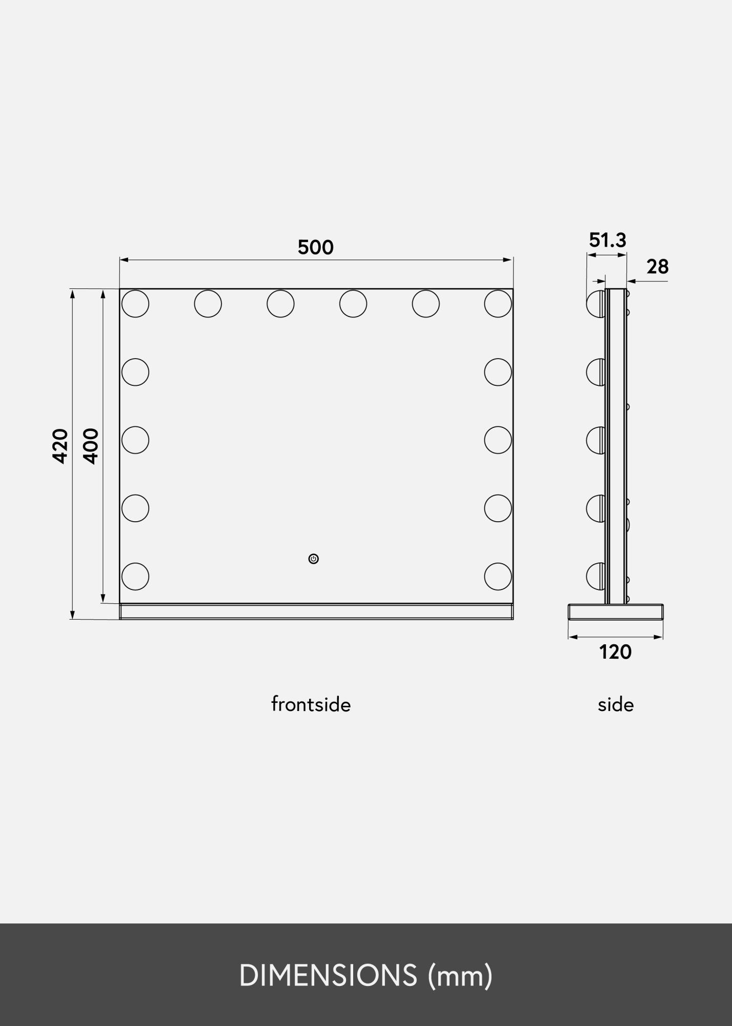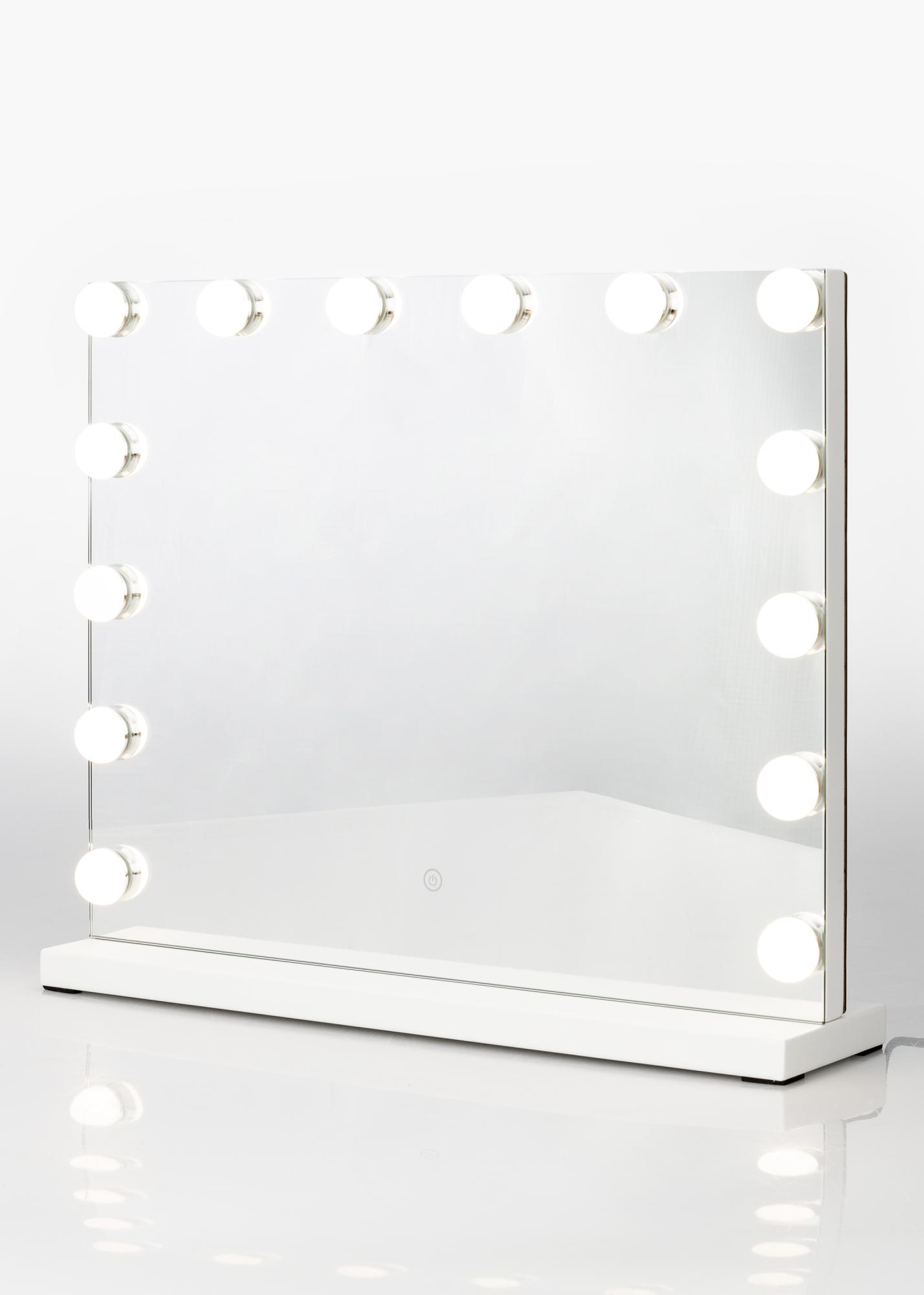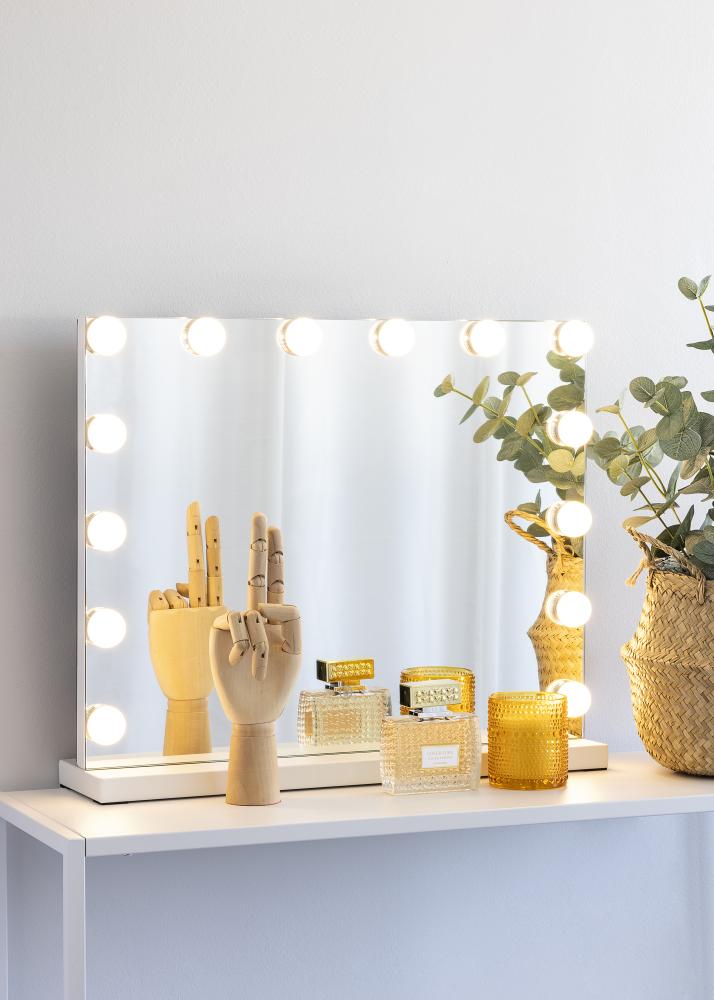Mit diesem luxuriösen Hollywood Schminkspiegel von KAILA lässt sich jeder Raum in ein Make-Up-Studio verwandeln! Großer Hollywood-Make-Up-Spiegel mit integrierter Beleuchtung in Form von 14 LEDs, die die große Spiegelfläche hübsch und dekorativ einrahmen. Die LED-Beleuchtung des Spiegels mit einem angenehm warmweißen Licht von 3000K ist dimmbar. Die Beleuchtung wird einfach durch Drücken des Touch-Sensors eingeschaltet. Durch Gedrückthalten der Taste für einige Sekunden lang kann gedimmt werden. Der Hollywood-Spiegel besitzt die Maße 50x45 cm.