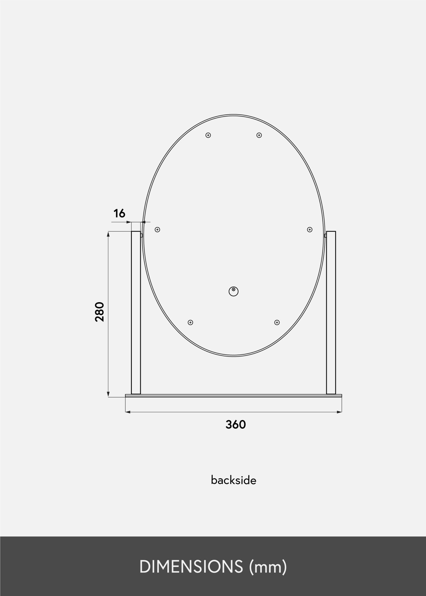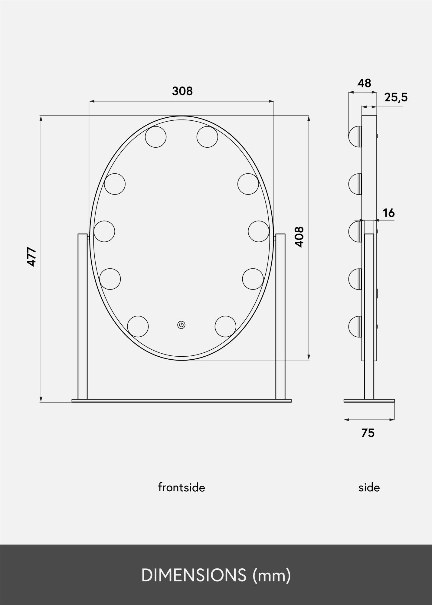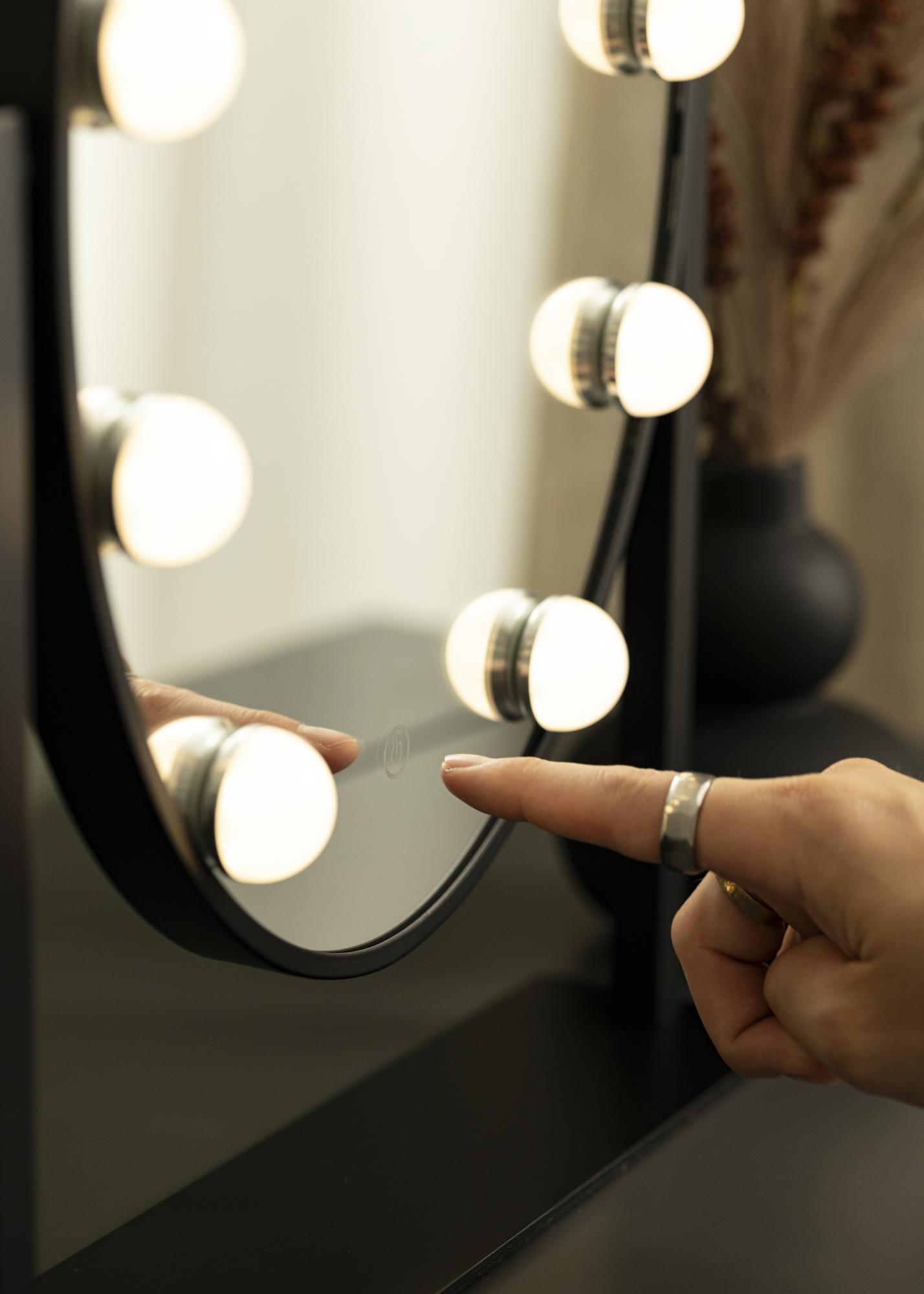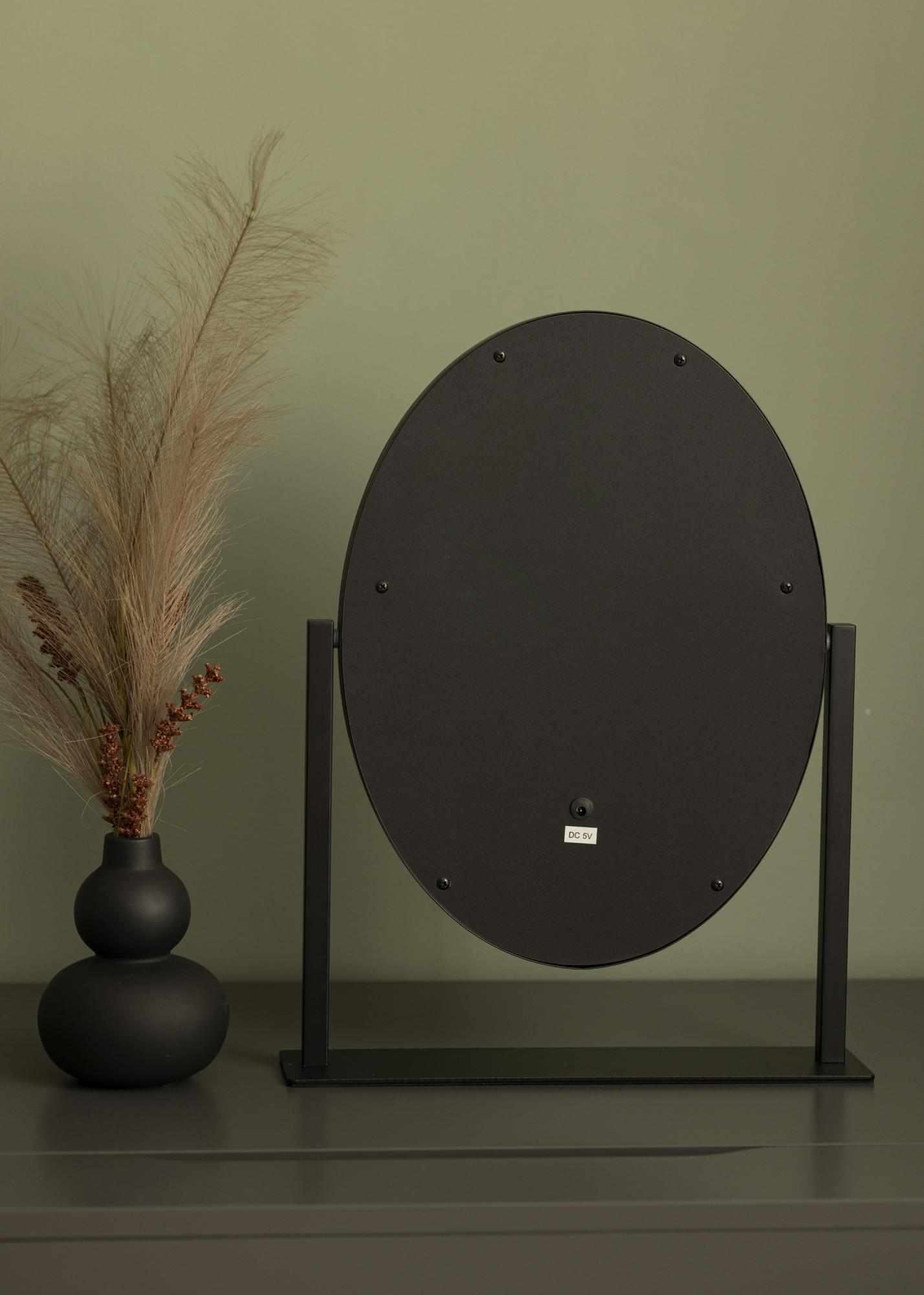 Eleganter, ovaler Schminkspiegel der schwedischen Marke KAILA. Schminkspiegel in trendy schwarzem Farbton mit integrierter, dimmbarer LED-Beleuchtung. Die LED-Beleuchtung in Form von 10 LEDs zeichnet sich durch das gleichmäßige, warmweiße Licht von 3000K aus. Die LED-Beleuchtung wird einfach durch Drücken des Touch-Sensors eingeschaltet. Die Lichtstärke kann durch Gedrückthalten der Taste für einige Sekunden lang eingestellt werden. Der Kosmetikspiegel misst 34x47 cm und kann 360° vertikal gedreht werden, sodass man sich auch aus verschiedenen Positionen bestens betrachten kann. Das zeitlose, glamouröse Design versprüht einen Hauch von Hollywood im Raum!