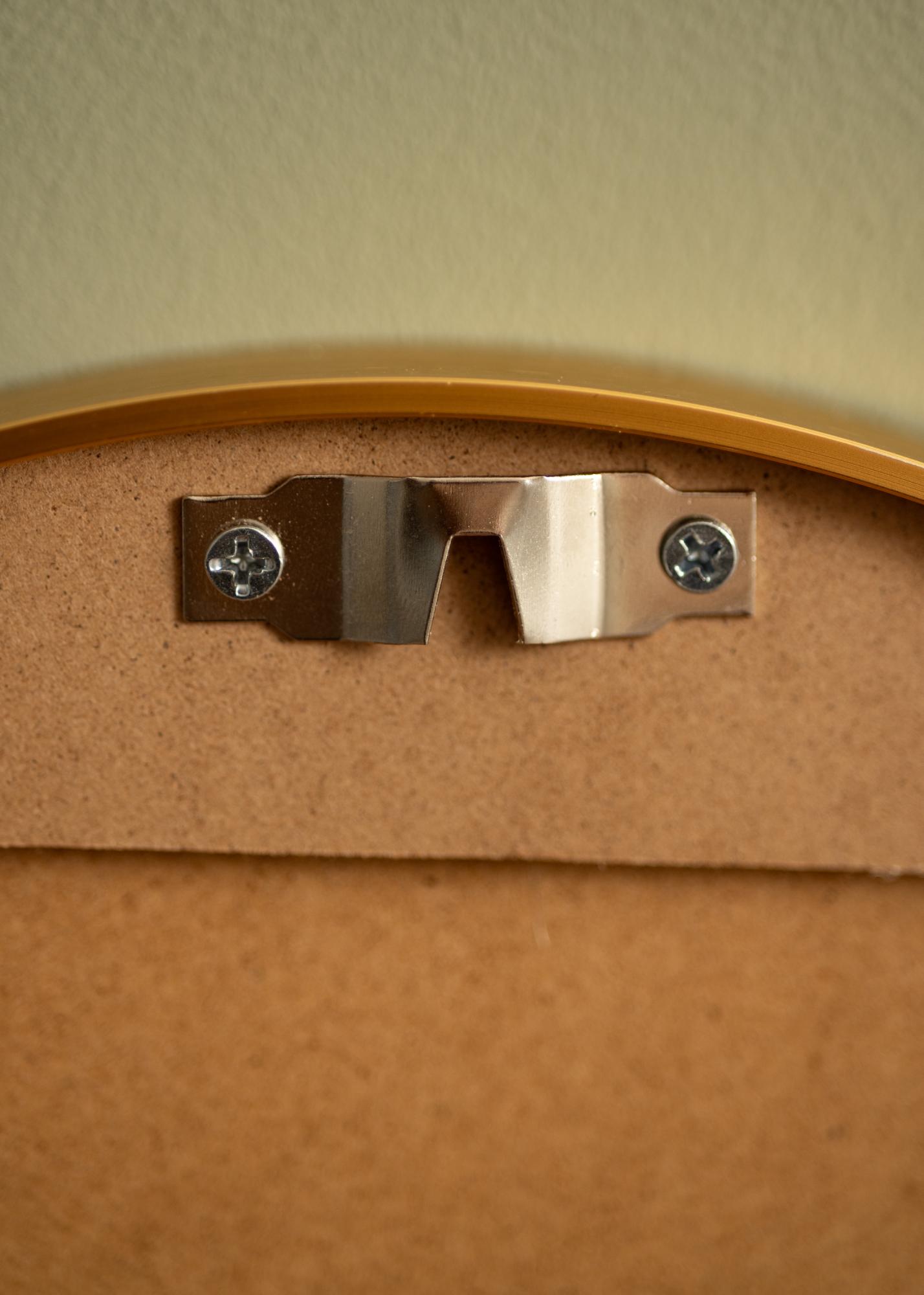 KAILA Round Mirror Edge Gold ist in verschiedenen Größen erhältlich. Diese Variante hat einen Durchmesser von 30 cm und verfügt über zwei vormontierte Wandhalterungen auf der Rückseite, die für eine einfache und stabile Befestigung an der Wand sorgen. Passende Schrauben und Dübel werden mitgeliefert.