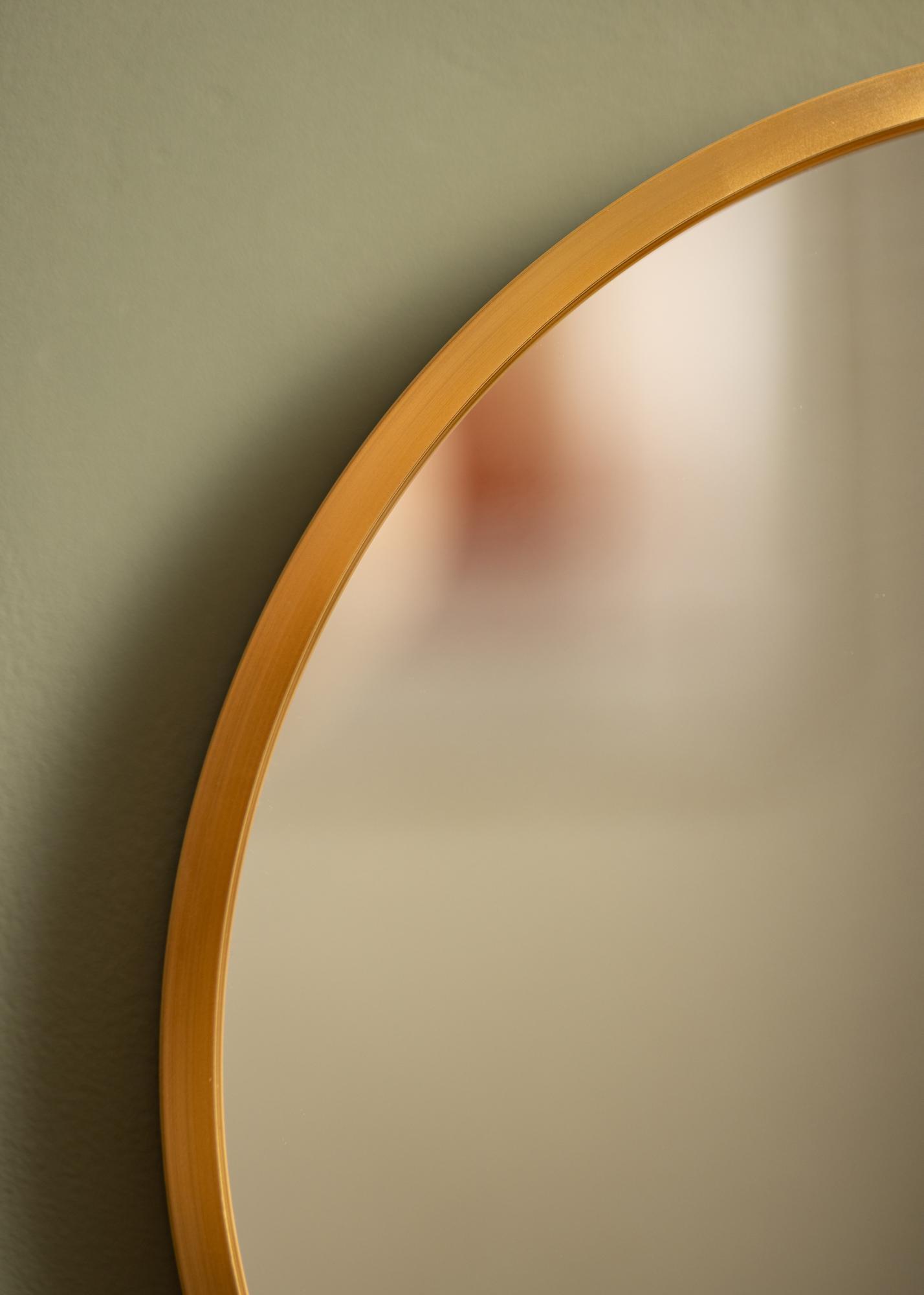 Ein runder Spiegel in stilvollem schwedischen Design mit einem Metallrahmen mit wunderschönem Gold-Finish. Die gebürstete Oberfläche des Rahmens lässt die schöne Goldfarbe etwas matter aussehen. Der Rahmen ist dünn und liegt damit voll im Trend, hat aber gleichzeitig - je nach Größe - eine Tiefe zwischen 30 und 40 mm, sodass er etwas aus der Wand herausragt und einen coolen 3D-Effekt erzeugt. Durch die Tiefe des Rahmens wirkt der Spiegel robust und behält gleichzeitig sein minimalistisches Erscheinungsbild bei.