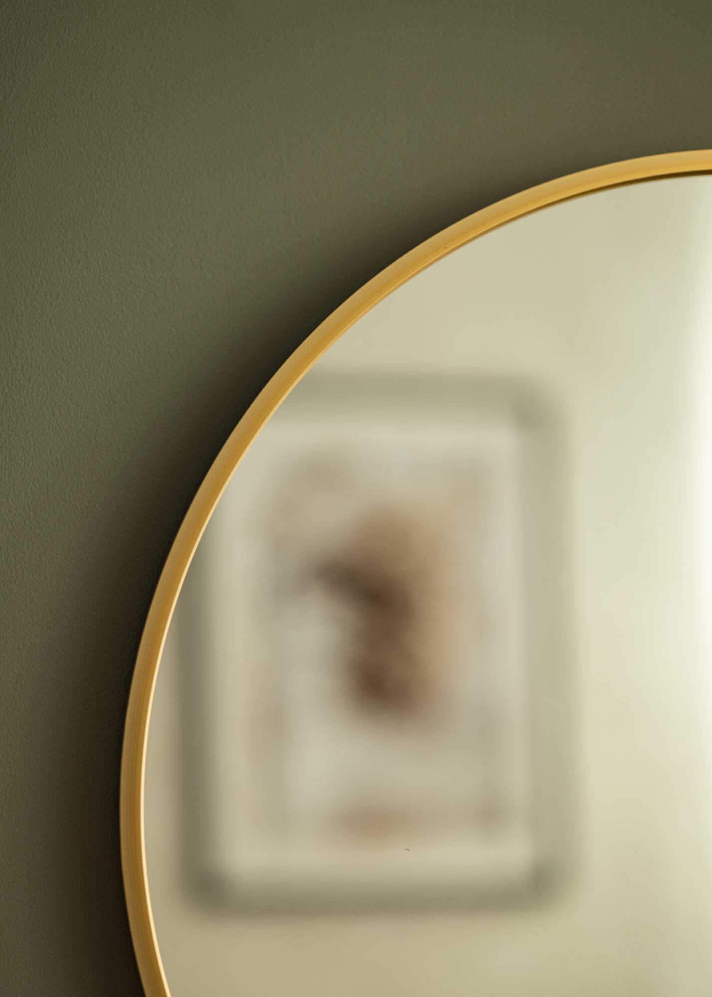Ein runder Spiegel in stilvollem schwedischen Design mit einem Metallrahmen mit wunderschönem Gold-Finish. Die gebürstete Oberfläche des Rahmens lässt die schöne Goldfarbe etwas matter aussehen. Der Rahmen ist dünn und liegt damit voll im Trend, hat aber gleichzeitig - je nach Größe - eine Tiefe zwischen 30 und 40 mm, sodass er etwas aus der Wand herausragt und einen coolen 3D-Effekt erzeugt. Durch die Tiefe des Rahmens wirkt der Spiegel robust und behält gleichzeitig sein minimalistisches Erscheinungsbild bei.