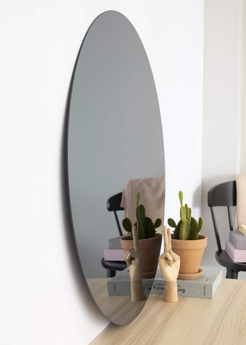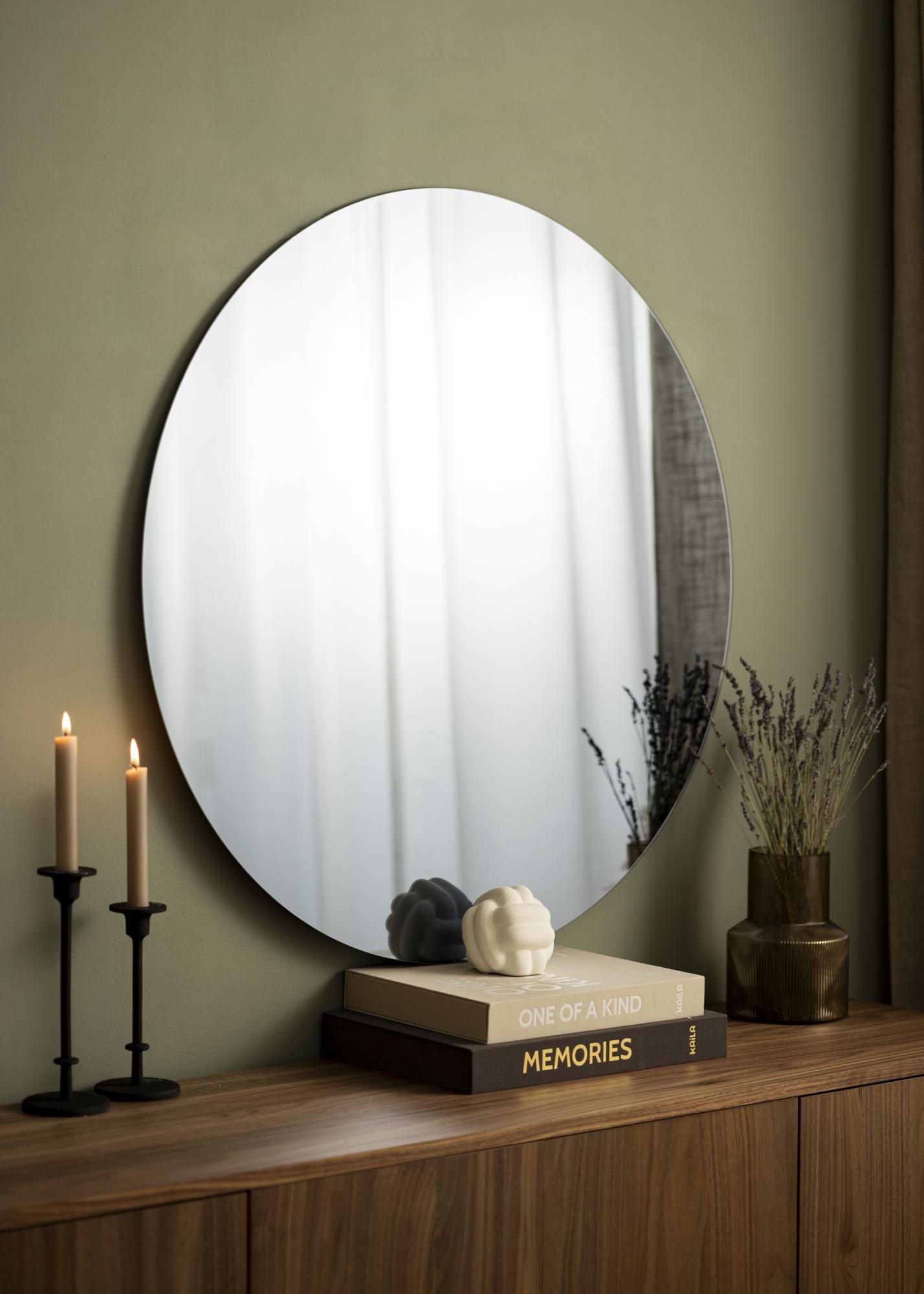Der runde, grau getönte Spiegel ist in mehreren Größen erhältlich. Diese Variante hat einen Durchmesser von 90 cm Ø.