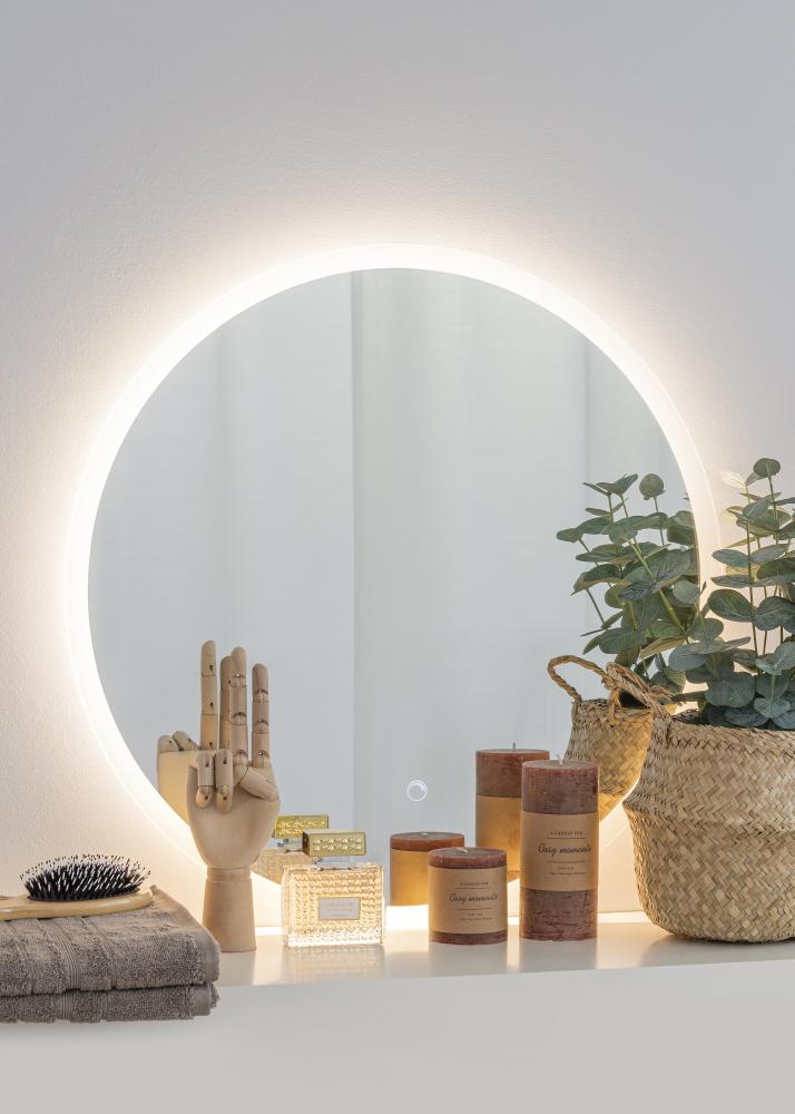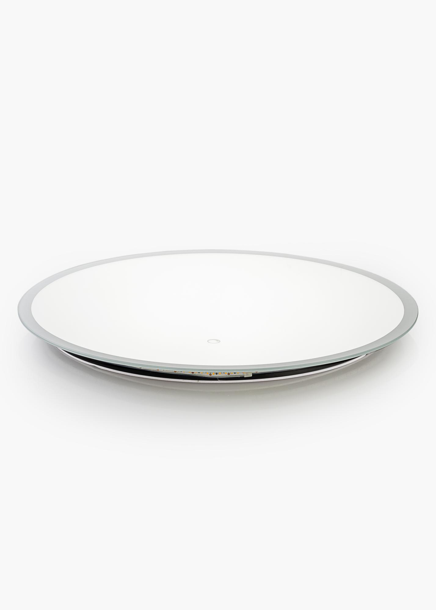 Klassischer, runder Badspiegel, formschön und elegant. Der Spiegel wird von einem gefrosteten Rand mit integrierter LED-Beleuchtung dekorativ umrahmt. Die LED-Beleuchtung ist dimmbar und kann einfach durch Gedrückthalten des wasserdichten Touch-Sensors für einige Sekunden lang eingestellt werden. Der angenehm warmweiße Lichtschein von 3000 K beleuchtet den Spiegel mit einem nach vorne hin strahlenden Lichtschein. Die letzte Einstellung wird beim erneuten Einschalten der Beleuchtung beibehalten. Dieser Spiegel ist mit Wandhalterungen versehen und für die Verwendung in Badezimmern geeignet. Der Spiegel ist für feste Installation vorgesehen und muss an einen Stromschalter angeschlossen werden. Damit der Spiegel ordnungsgemäß und korrekt funktioniert, muss er an einen normalen Schalter angeschlossen werden, nicht an einen Dimmschalter.