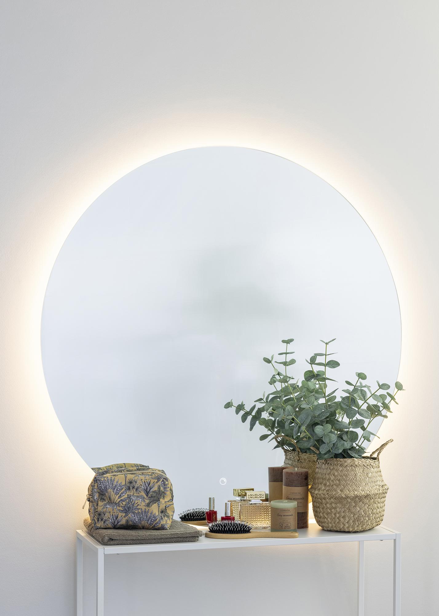 Klassischer Badezimmerspiegel rund in schwedischem Design von KAILA. Dieser Badspiegel ist mit integrierter LED-Beleuchtung ausgestattet, die den Spiegel dekorativ von hinten beleuchtet und mit einem einen angenehm warmweißen Schein, Lichtfarbe 3000 K, nach vorne strahlt. Die LED-Beleuchtung ist dimmbar und kann einfach durch Gedrückthalten des Touch-Sensors für einige Sekunden lang eingestellt werden. Die LED-Technologie ist eine energieschonendere Lichtquelle und steht für ein gleichmäßiges, natürliches Licht.