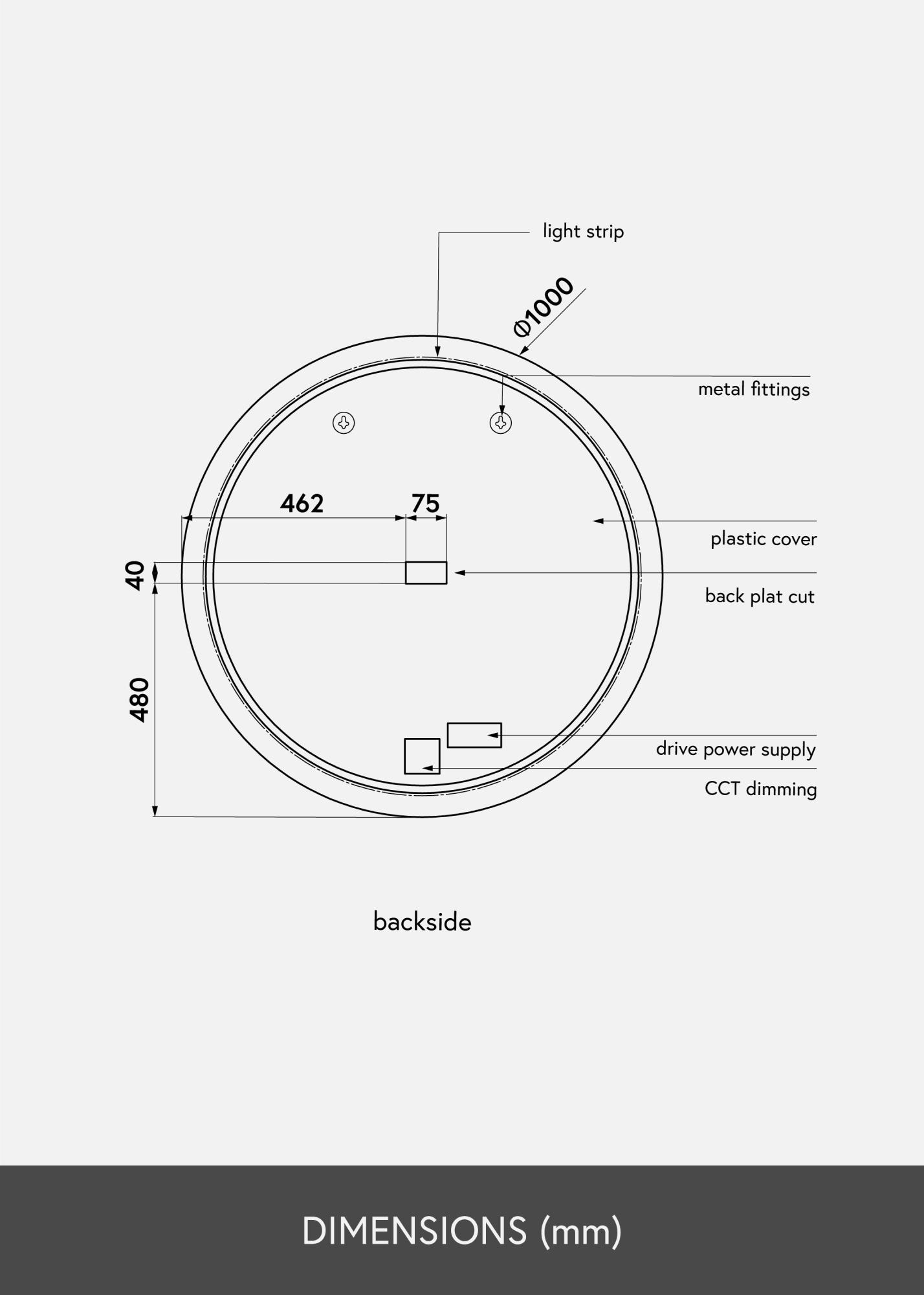 Selbstverständlich ist dieser Spiegel für die Verwendung in Badezimmern geeignet, kann aber auch genausogut in anderen Räumen verwendet werden. Die schöne, elegante Formgebung passt in nahezu jedes Wohnambiente. Der Spiegel besitzt einen Durchmesser von 100 cm und eine Tiefe von 3 cm. Außerdem ist dieser Badspiegel mit Wandhalterungen versehen. Der Spiegel ist für feste Installation vorgesehen und muss an einen Stromschalter angeschlossen werden. Damit der Spiegel ordnungsgemäß und korrekt funktioniert, muss er an einen normalen Schalter angeschlossen werden, nicht an einen Dimmschalter.