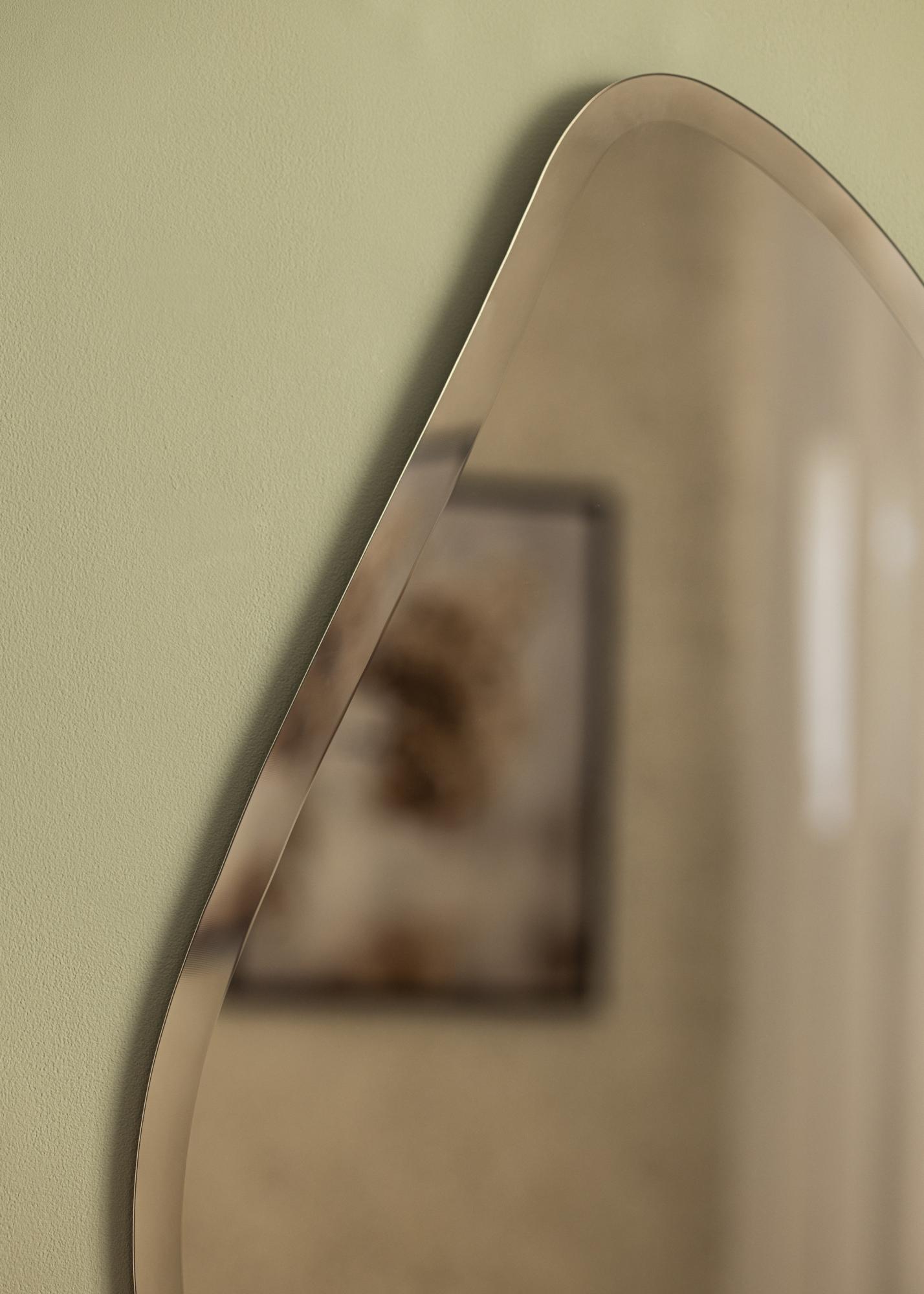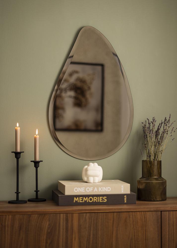 Trendiger, tropfenförmiger Wandspiegel mit getöntem Spiegelglas in eleganter, dunklerer bronzefarbener Nuance. Eine ausgefallenere Spiegelform, die nicht überall zu finden ist. Das getönte Spiegelglas verleiht dem Spiegel einen ganz besonderen Effekt und der hübsche, dunklere Bronzeton lässt sich gut mit anderen Farben kombinieren und passt damit zu vielen Wohneinrichtungen. Der Spiegel ist im Profil sehr flach und besitzt keinen Rahmen, was zusammen mit dem Facettenschliff den eleganten, modernen Ausdruck des Spiegels noch mehr betont. Ein sehr dekorativer Wandspiegel, der garantiert als außergewöhnlicher Blickfang die Blicke auf sich ziehen wird - ganz gleich, ob er im Wohnzimmer, im Flur oder im Schlafzimmer aufgestellt wird.