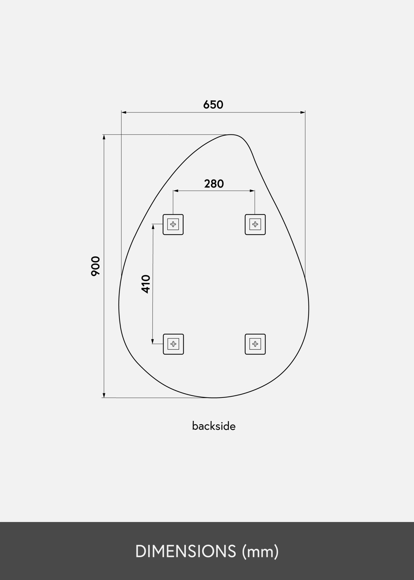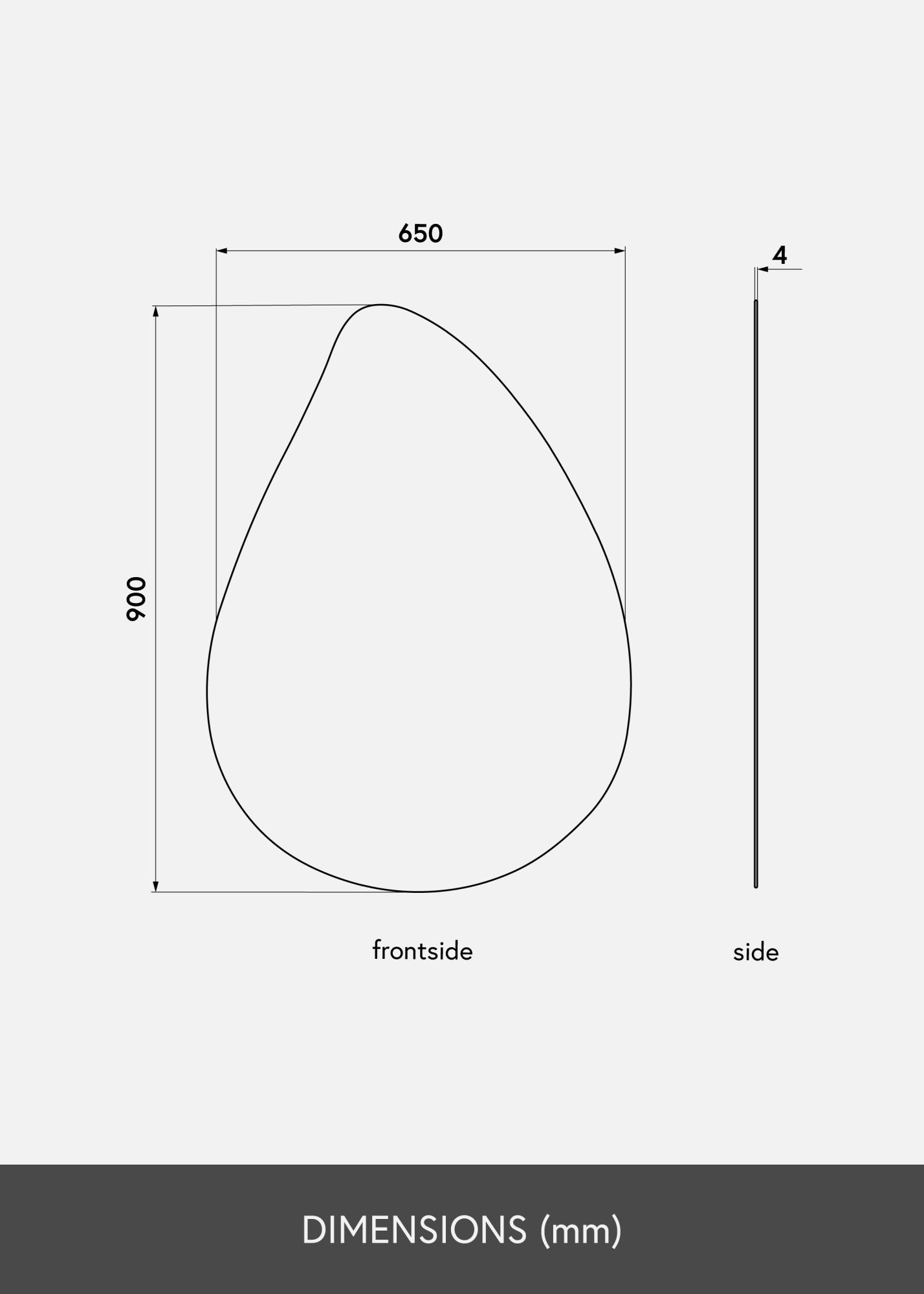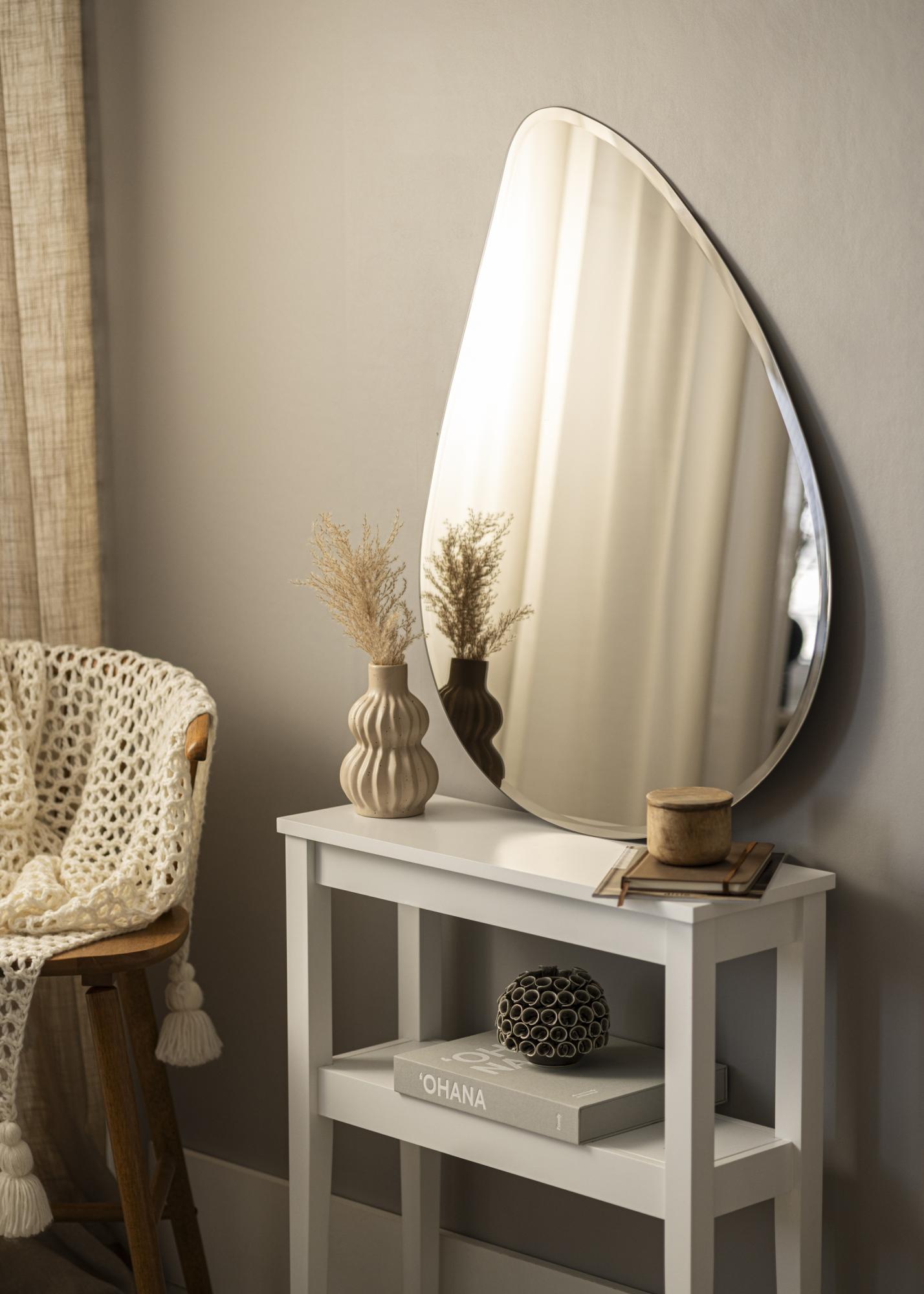 Dieser Wandspiegel in Tropfenform ist in mehreren Größen erhältlich; die abgebildete Variante hat die Größe 65x90 cm.