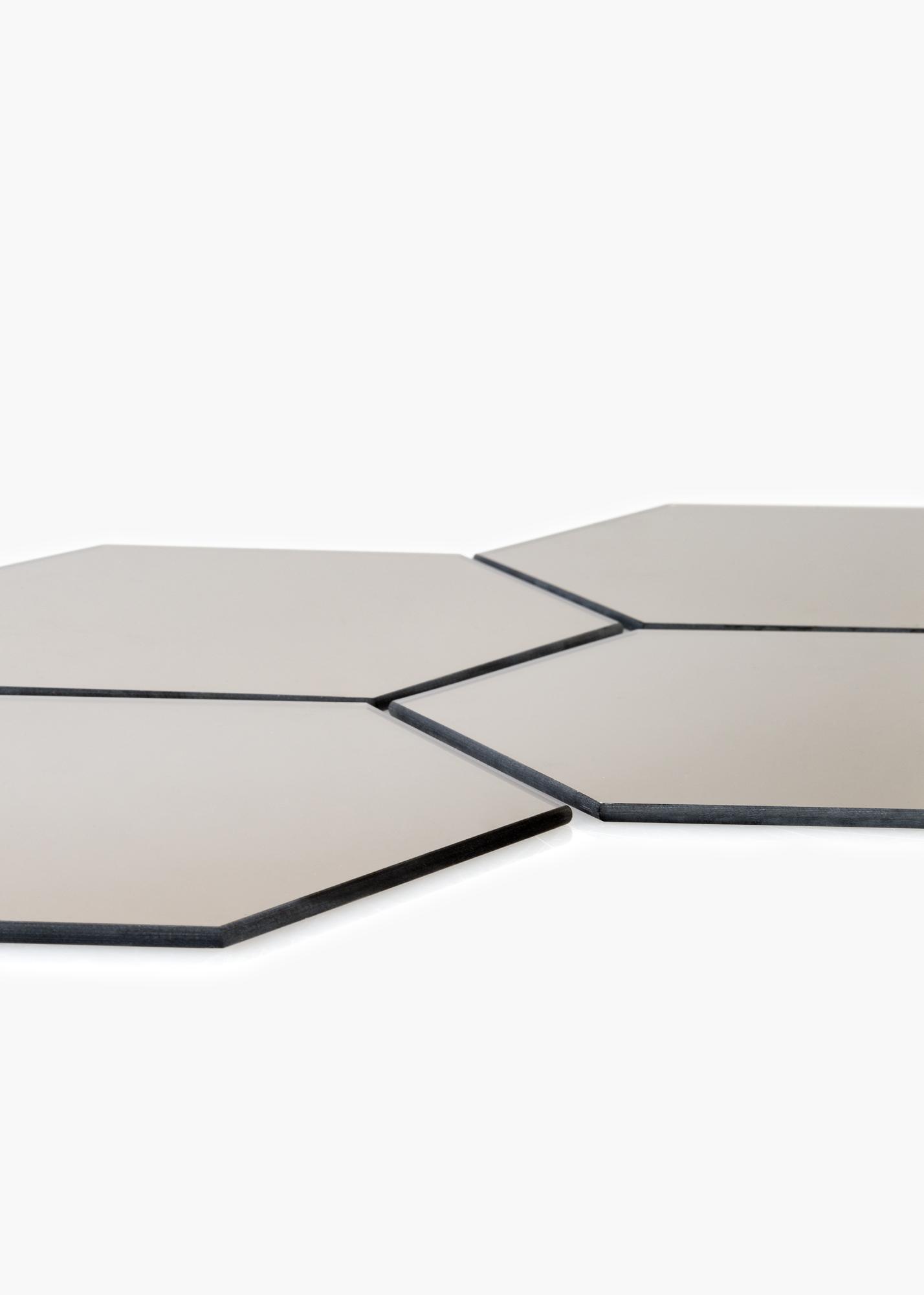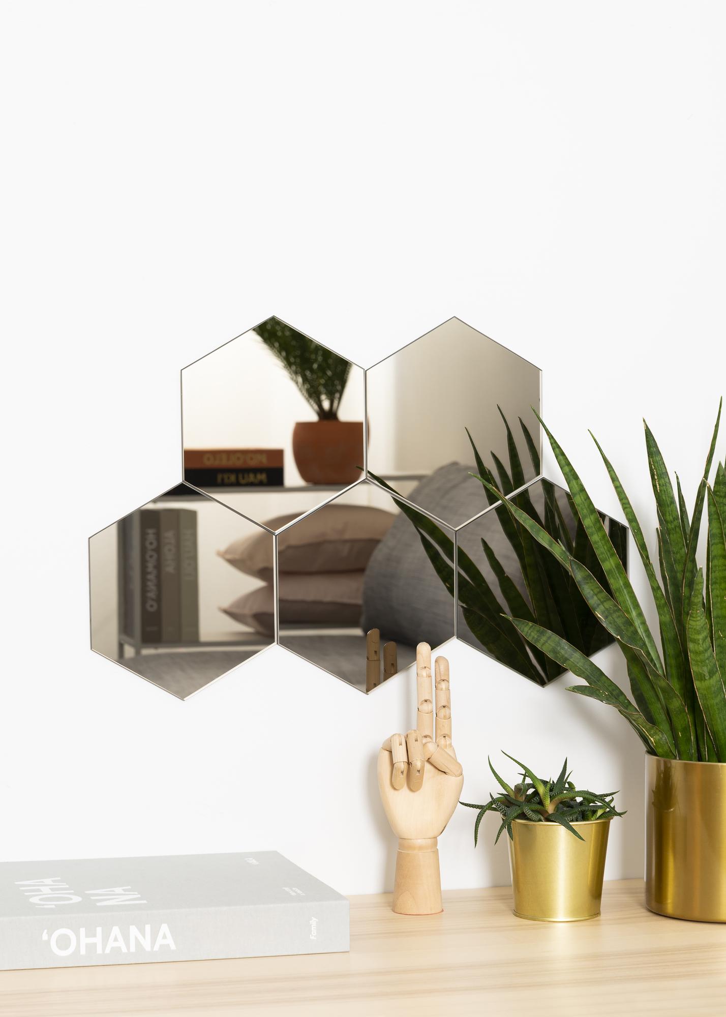 Die Wandspiegel können nach Belieben angeordnet werden. Als Ensemble, nebeneinander in einer Reihe oder einfach so, wie du es dir vorstellst. Jeder Spiegel besitzt die Maße 18x21 cm. Sollte der Wunsch aufkommen, die Wanddekoration zu einem späteren Zeitpunkt zu erweitern, kann sie einfach mit weiteren 5er-Packs ergänzt werden. Diese Hexagon Spiegel sind auch mit getöntem Spiegelglas in Roségold erhältlich sowie mit klarem Spiegelglas. Durch die Kombination von farbig getöntem und klarem Spiegelglas kann eine tolle, lebendige und funktionelle Wanddekoration entstehen.