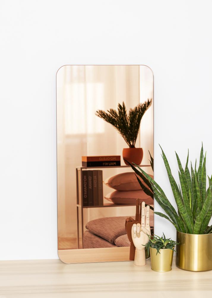 Dieser rechteckige Spiegel ist mit dekorativen abgerundeten Ecken versehen. Dieses Detail lockert den Gesamteindruck des Spiegels auf und verleiht ihm ein elegantes Aussehen. Der Spiegel hat zudem ein roségoldfarbenes Spiegelglas, was ihn sehr auffällig und modern erscheinen lässt. Dass der Spiegel keinen Rahmen hat und nur 4 mm dünn ist, sind weitere Details, die den modernen Eindruck des Spiegels verstärken. Heraus kommen ein funktioneller Wandspiegel und ein moderner Einrichtungsgegenstand in einem!