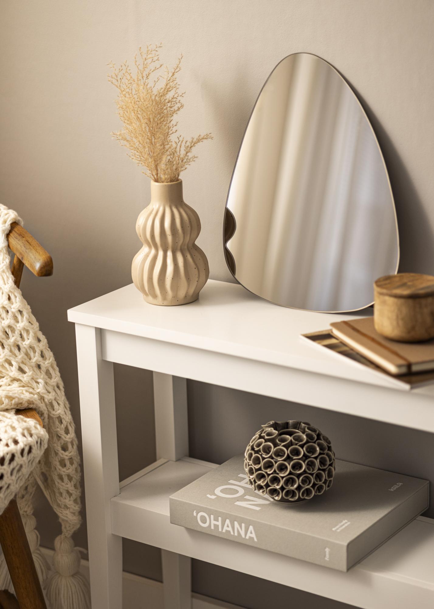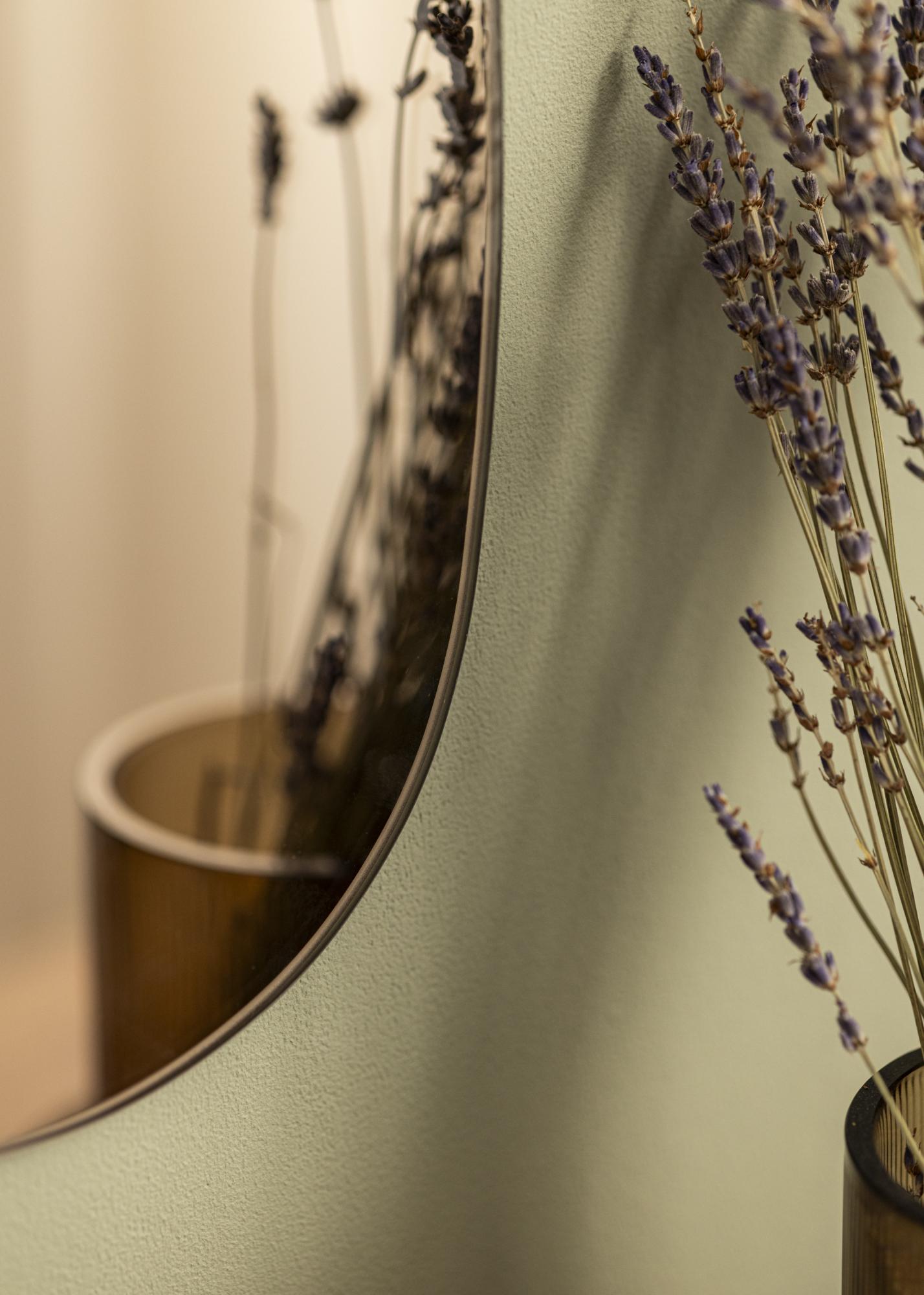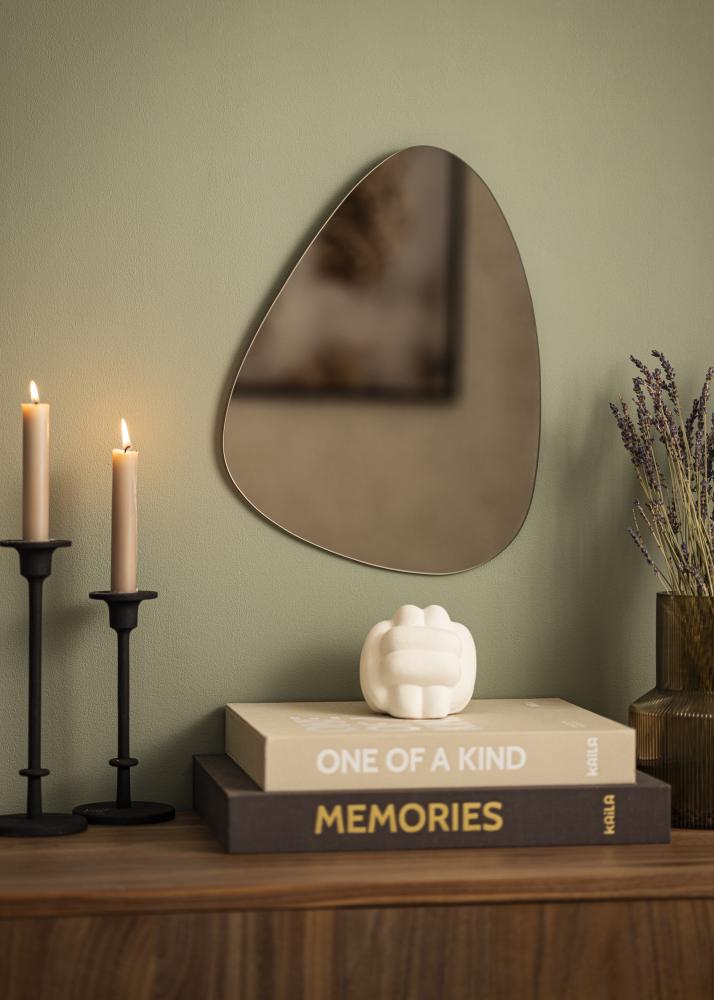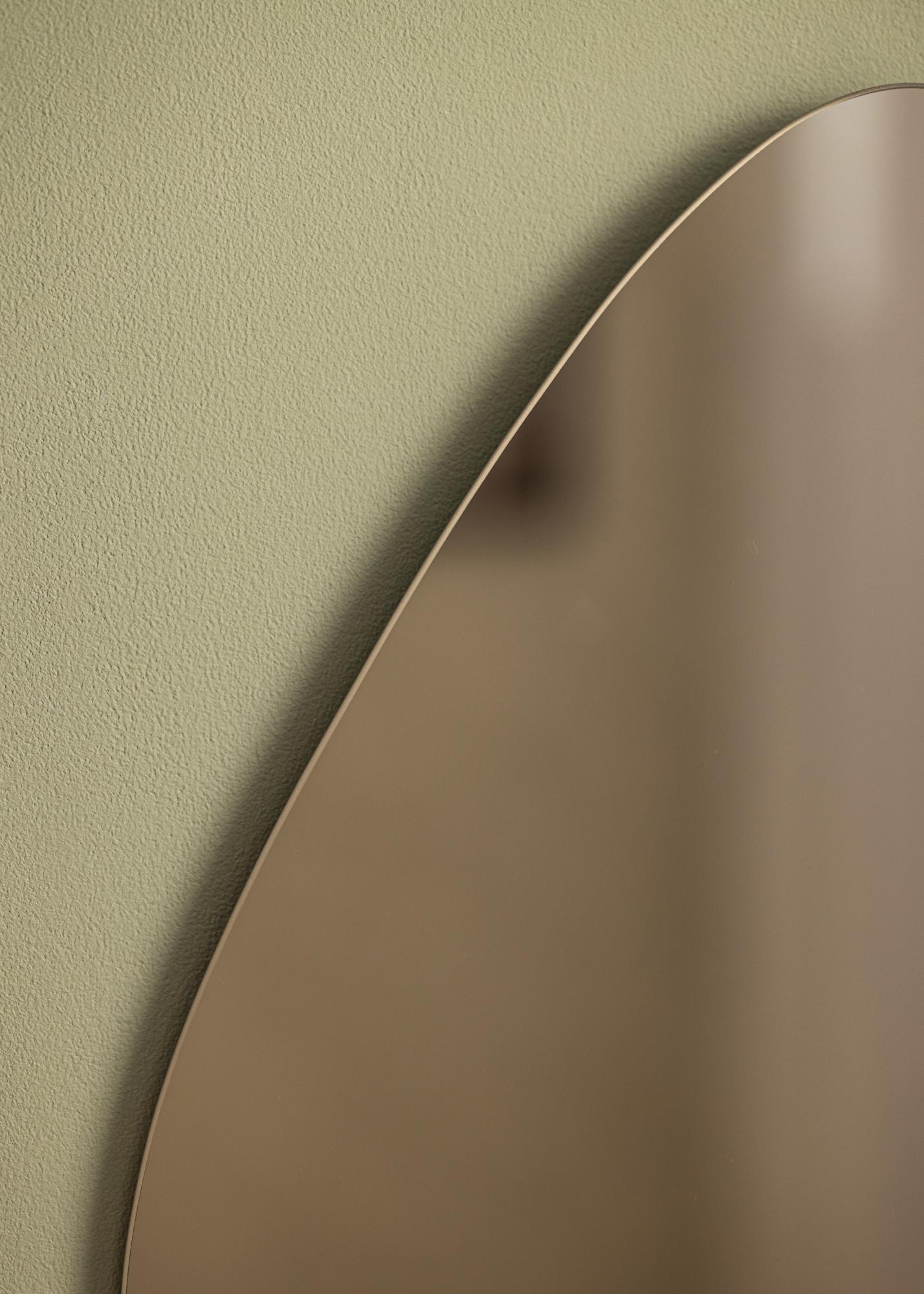 Dieser asymmetrische Wandspiegel ist ein wirklich hübsches Einrichtungsaccessoire, das voll im Trend liegt. Die außergewöhnliche, eierförmige Formgebung wird mit dem stilvoll getönten Spiegelglas in elegantem Bronzeton kombiniert. Das wiederum betont die moderne Ausstrahlung und harmoniert wunderbar mit vielen Farbtönen. Die fließende, weiche Form des im Profil flachen, rahmenlosen Spiegels, besitzt eine elegante, ganz eigene Ausstrahlung. Ein wirklich ausgesuchtes Einrichtungsdetail, funktionell und dekorativ zugleich. Passt wunderbar ins Wohnzimmer, Schlafzimmer oder den Flur.